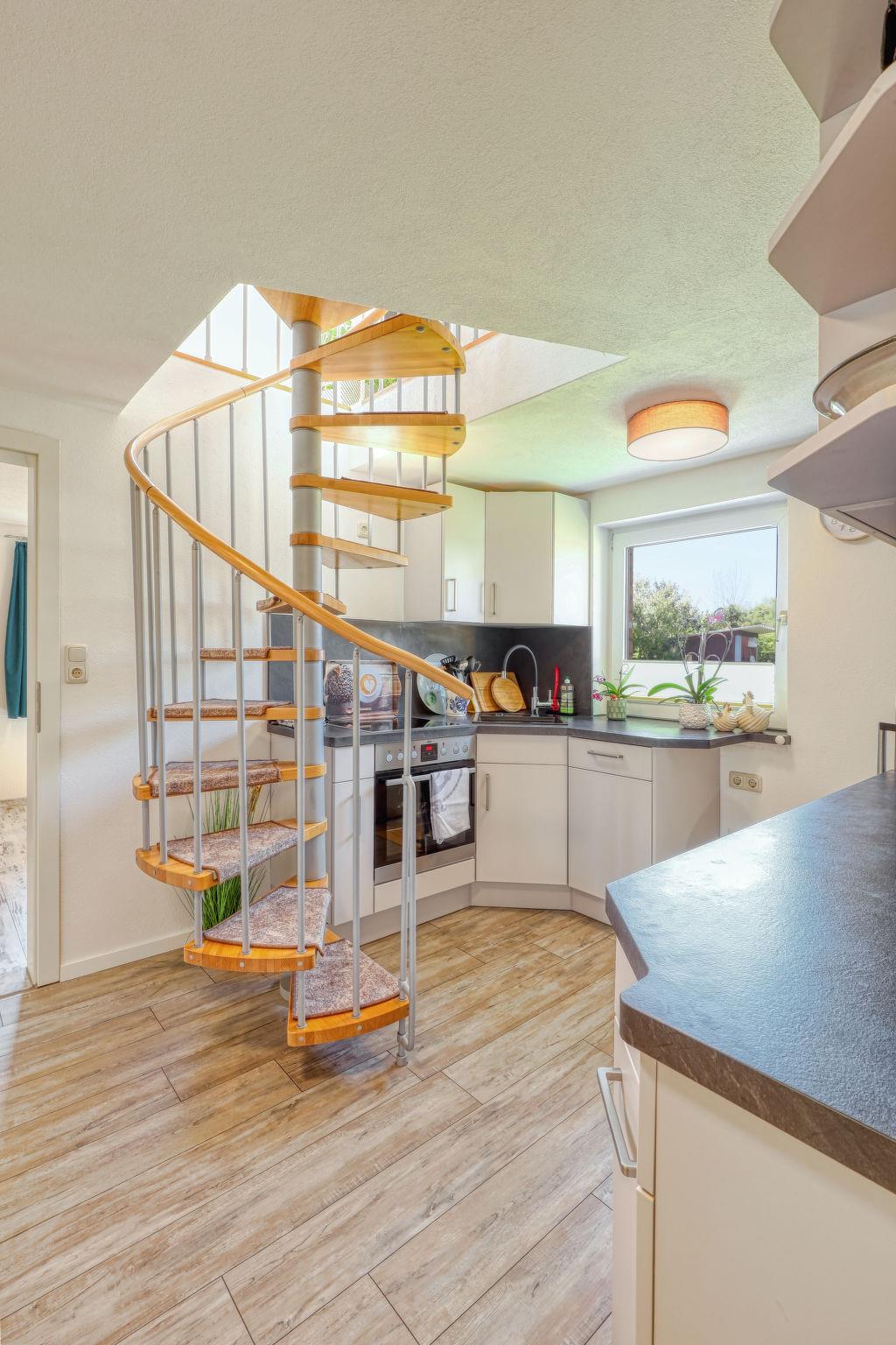 3-room house 85 m2. Tasteful and cosy furnishings: living/dining room with Scandinavian wood stove, satellite TV and gas heating. 1 double bedroom with 1 double bed (180 cm, length 200 cm). Open kitchen (oven, dishwasher, 4 ceramic glass hob hotplates, toaster, kettle, microwave, electric coffee machine). Shower/WC. Underfloor heating. Upper floor: (spiral staircase) living/sleeping room with sloping ceilings with 1 double bed (180 cm, length 200 cm). Large terrace 15 m2, small terrace 4 m2. Terrace furniture, barbecue, deck chairs (2). Facilities: children's high chair, baby cot for up to 2 year olds. Internet (WiFi, free). Please note: suitable for families. Non-smoking house. Smoke alarm.