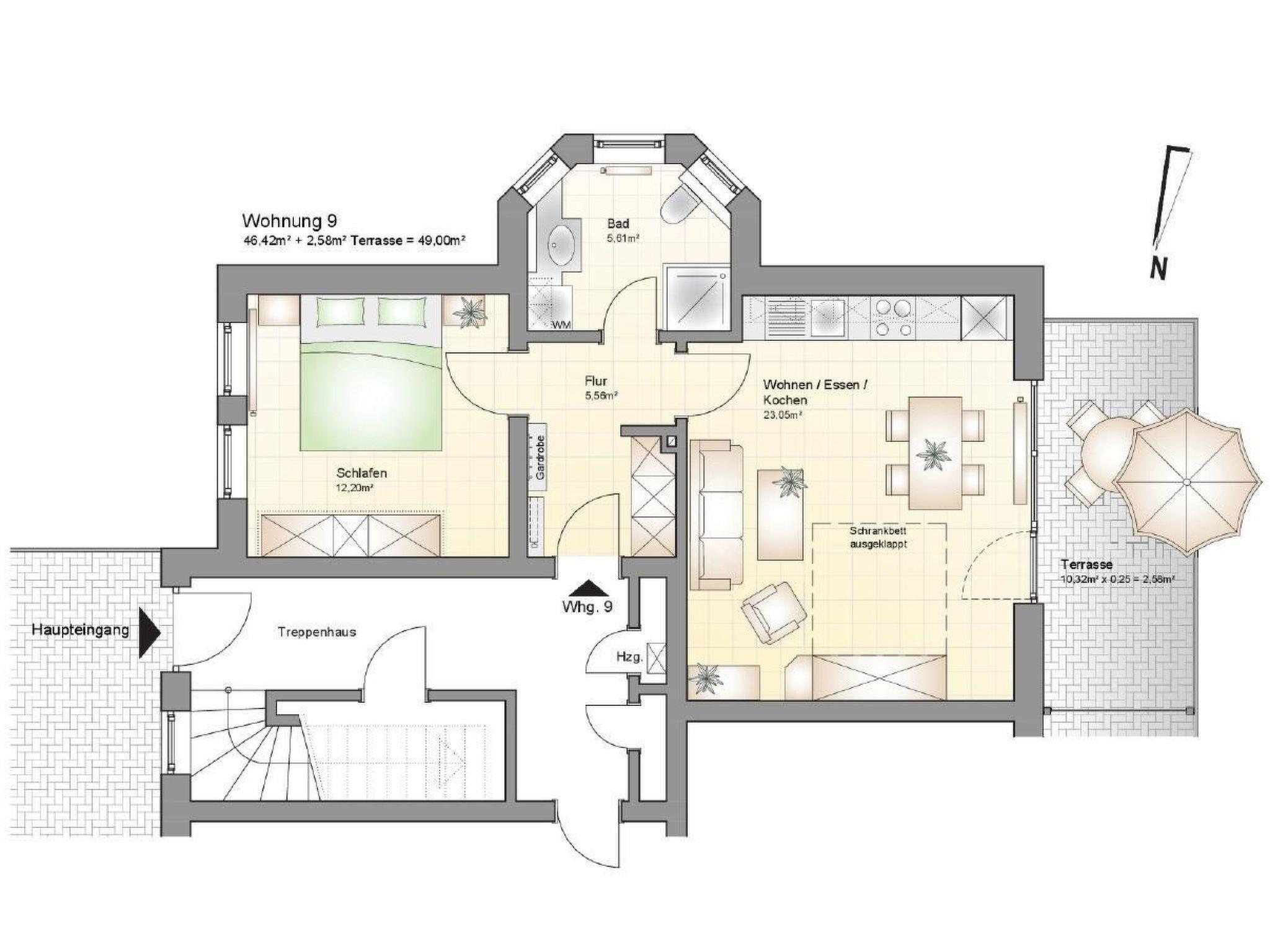 The interior is characterised by a spacious living/dining area with an integrated kitchenette. The kitchen is fully equipped with everything you could possibly need on holiday - from a cooker with oven, dishwasher and fridge/freezer combination to a microwave, coffee machine, kettle and toaster. In addition to a separate bedroom with a double bed, the living area has an innovative wardrobe double bed, which can be easily assembled and disassembled without having to change the bedding every evening. There is also a daylight shower room with washing machine and a full range of multimedia equipment, including a TV, DVD player and a small compact hi-fi system.