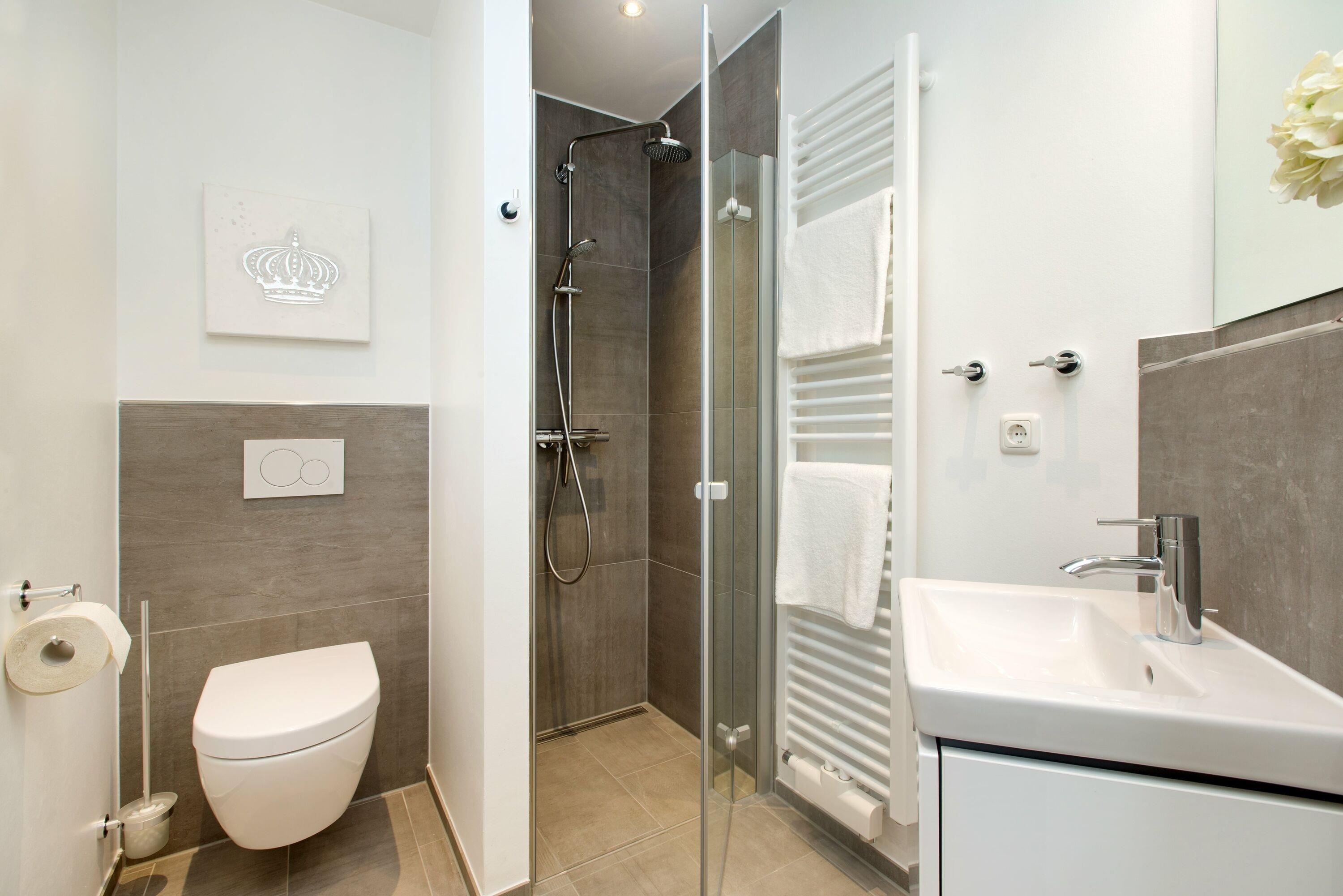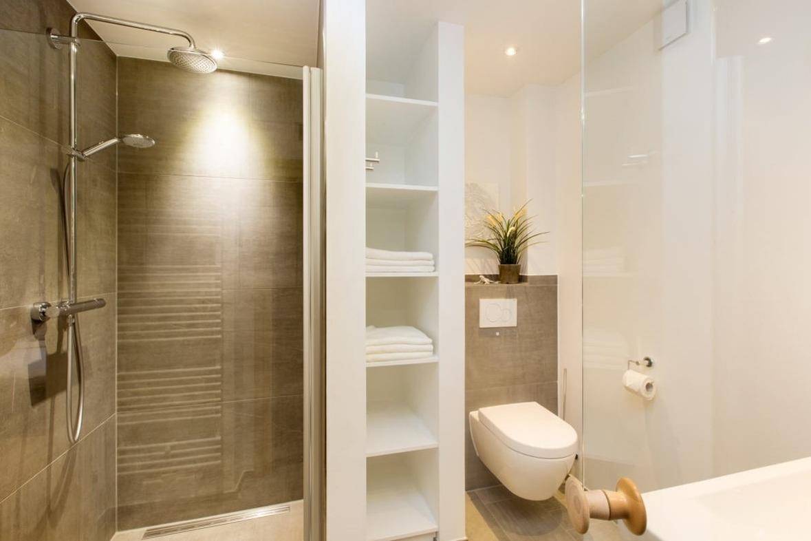 Die drei Schlafzimmer sind mit zwei bequemen Boxspringbetten und zwei Einzelbetten eingerichtet. Verdunkelnde Plissees sorgen für erholsame Nächte, und alle Schlafzimmer bieten ausreichend Stauraum für Ihr Gepäck.