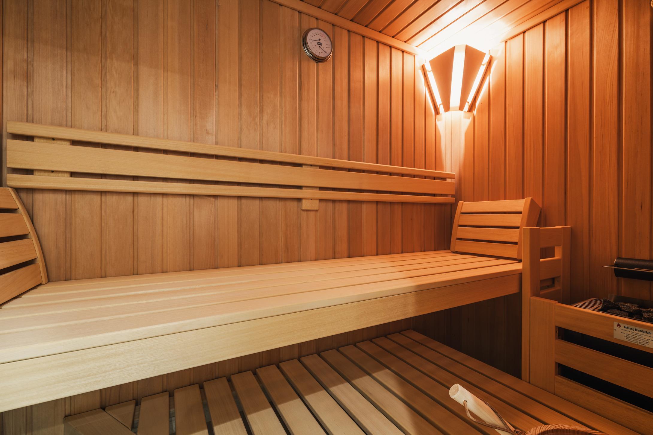 Modernes Bad mit ebenerdiger Dusche und Zugang zur privaten Sauna