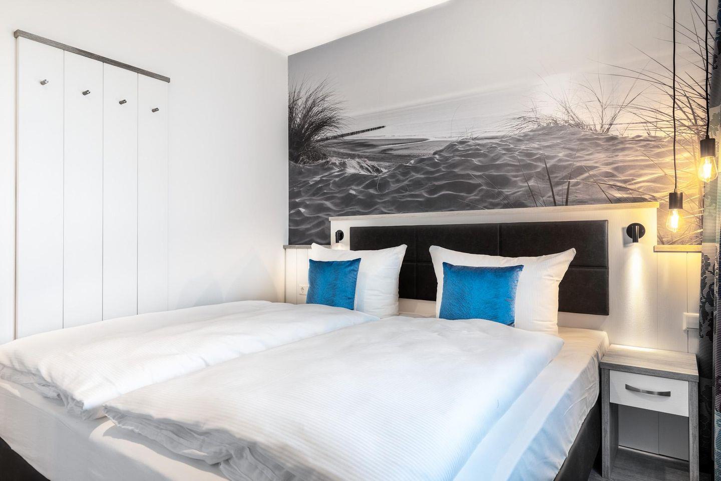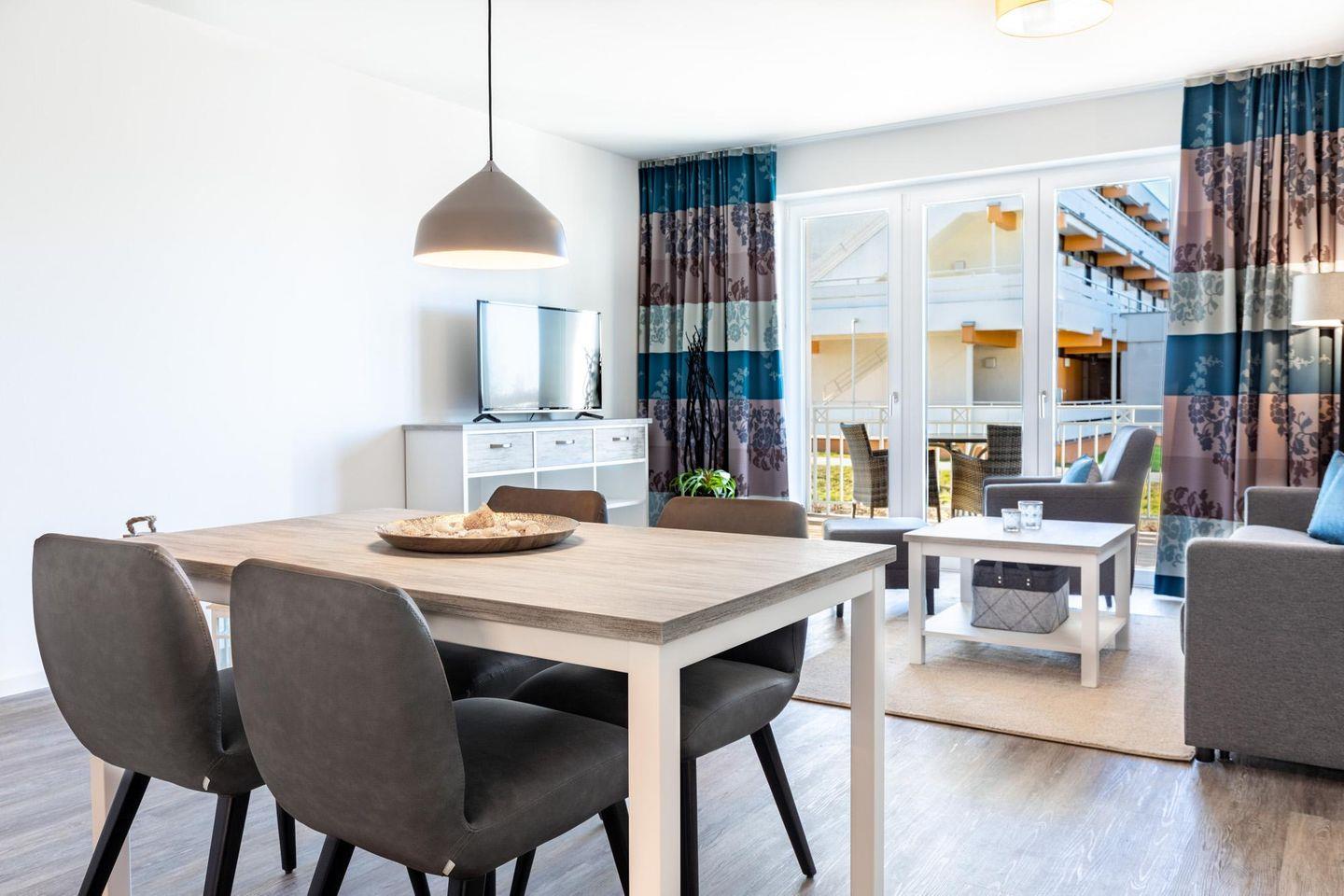 Das 58 m² große 2-Zimmer Apartment ist für bis zu 4 Personen geeignet. Besonders hervorzuheben ist der sonnige und überdachte Balkon in West-Lage; hier genießt ihr das wohltuende Meeresklima. Auch euer Vierbeiner ist hier herzlich willkommen!