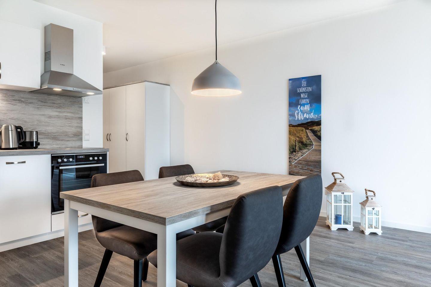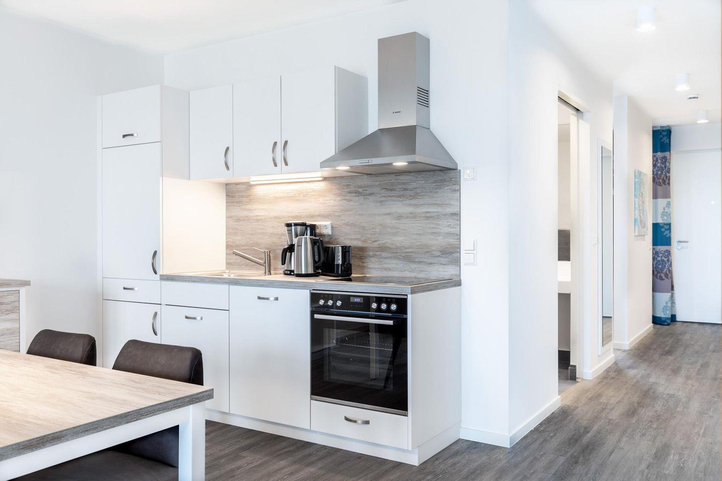 Das lichtdurchflutete und familienfreundliche Nichtraucher-Apartment verfügt über Fußbodenheizung, sonnenschutzverglaste und bodentiefe Fensterflächen, kostenfreies WLAN und eine voll ausgestattete offene Küche mit Geschirrspüler, Kühlschrank und Gefrierfach, Kaffeemaschine, Toaster, Wasserkocher, Herd mit Glaskeramikkochfeld und Backofen.