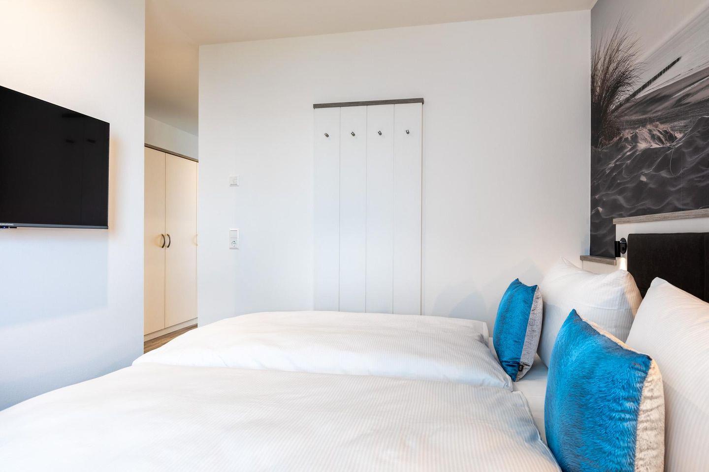Im modern-behaglichen Wohn-Essbereich befindet sich eine Doppelschlafcouch (1,60 x 1,95 m) und ein großer Flatscreen-TV (43 Zoll). Der moderne Schlafbereich mit seinem offenen Wohnkonzept bietet hohen Schlafkomfort durch zwei Boxspringbetten (0,90 x 2,00 m) und ist mit einem weiteren Flatscreen-TV (40 Zoll) sowie Kleiderschrank und Sitz-/Kofferbank ausgestattet. Das stilvolle Badezimmer verfügt über eine ebenerdige Regendusche, WC, Waschtisch mit Föhn, Handtuchheizkörper und Fußbodenheizung.