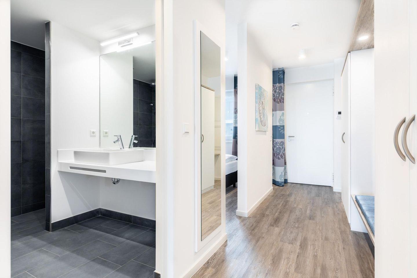Im Foyer mit Rezeption heißen wir euch herzlich willkommen und stehen euch während eures Aufenthaltes bei Fragen gern zur Seite. Auf Wunsch nutzt ihr ganz nach Belieben, die attraktiven Annehmlichkeiten der Apartmentanlage Meerblickvilla - im Erdgeschoss befindet sich ein moderner Saunabereich mit finnischer Sauna, Biosauna und Ruheraum. In der Zeit vom 09.02.- 20.03.2026 steht euch der Saunabereich aufgrund von Instandsetzungsmaßnahmen nicht zur Verfügung.