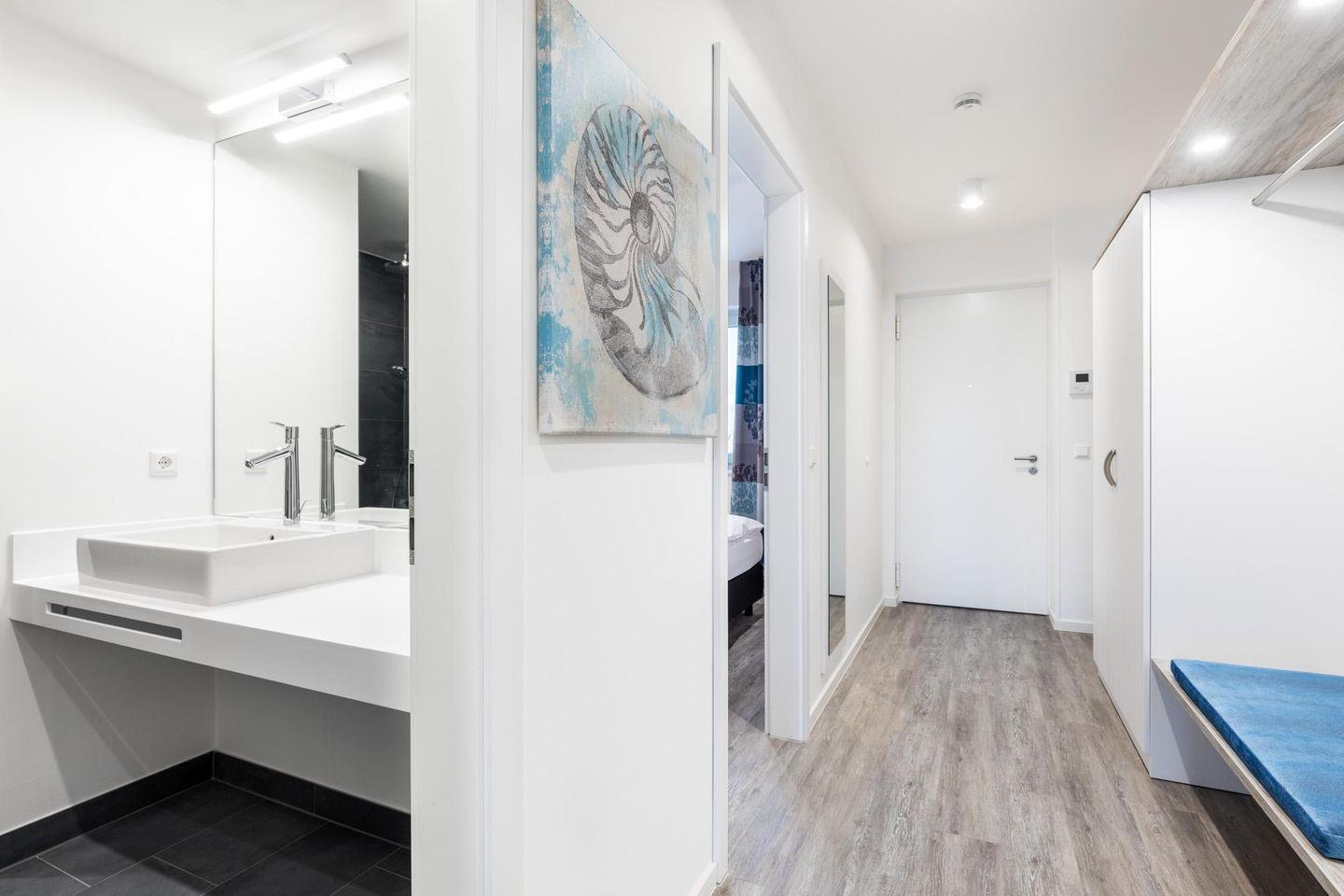 Im Foyer mit Rezeption heißen wir euch herzlich willkommen und stehen euch während eures Aufenthaltes bei Fragen gern zur Seite. Auf Wunsch nutzt ihr ganz nach Belieben, die attraktiven Annehmlichkeiten der Apartmentanlage Meerblickvilla - im Erdgeschoss befindet sich ein moderner Saunabereich mit finnischer Sauna, Biosauna und Ruheraum. In der Zeit vom 09.02.- 20.03.2026 steht euch der Saunabereich aufgrund von Instandsetzungsmaßnahmen nicht zur Verfügung.