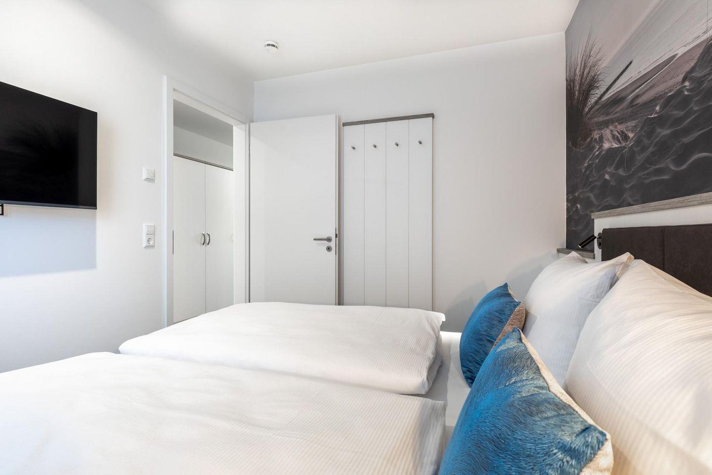 Das separate Schlafzimmer bietet hohen Schlafkomfort durch zwei moderne Boxspringbetten (0,90 x 2,00 m) und ist mit einem weiteren Flatscreen-TV (40 Zoll) sowie Kleiderschrank und Sitz-/Kofferbank ausgestattet. Das stilvolle Badezimmer verfügt über eine ebenerdige Regendusche, WC, Waschtisch mit Föhn sowie Kosmetikspiegel, Handtuchheizkörper und Fußbodenheizung.