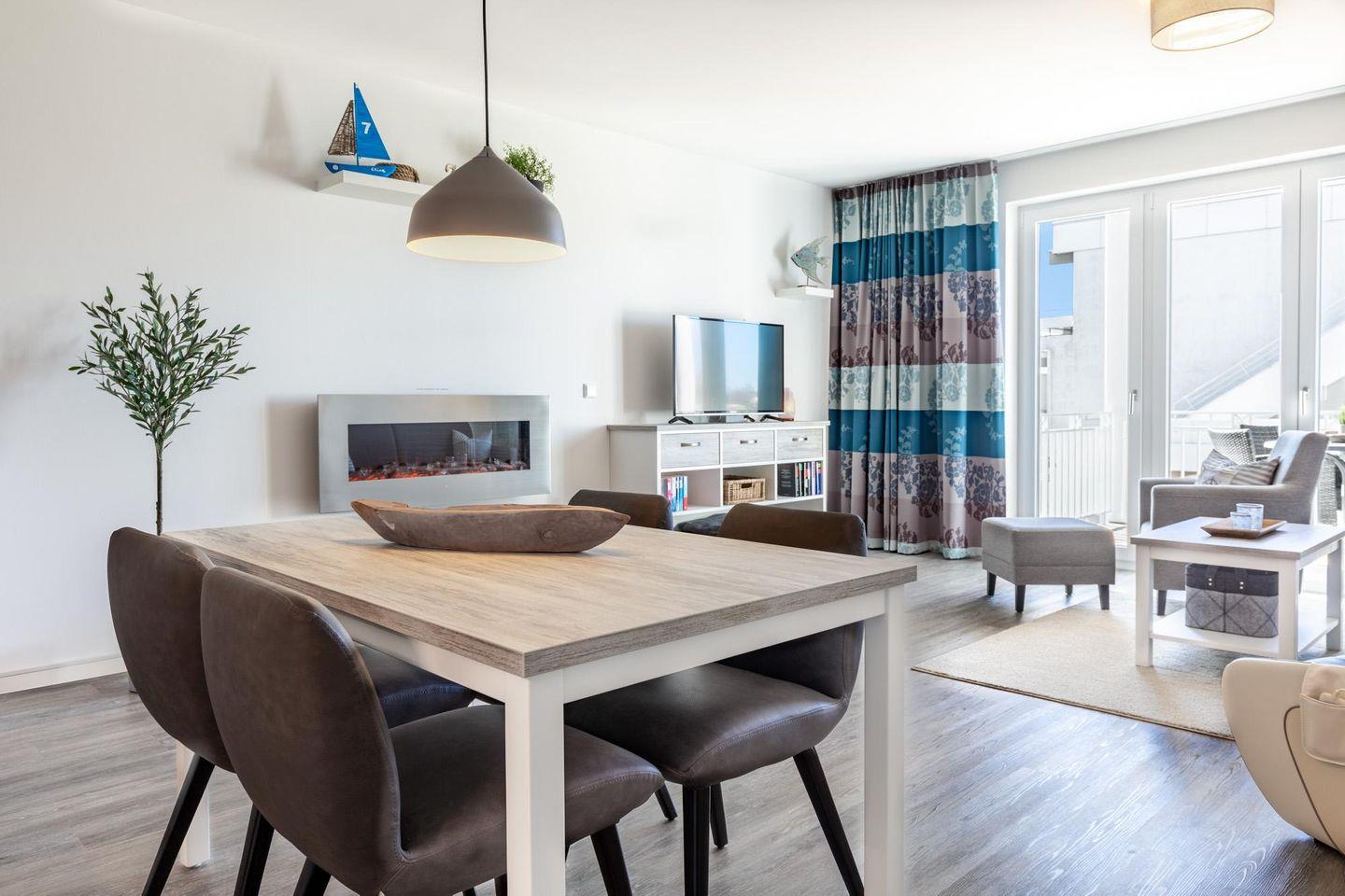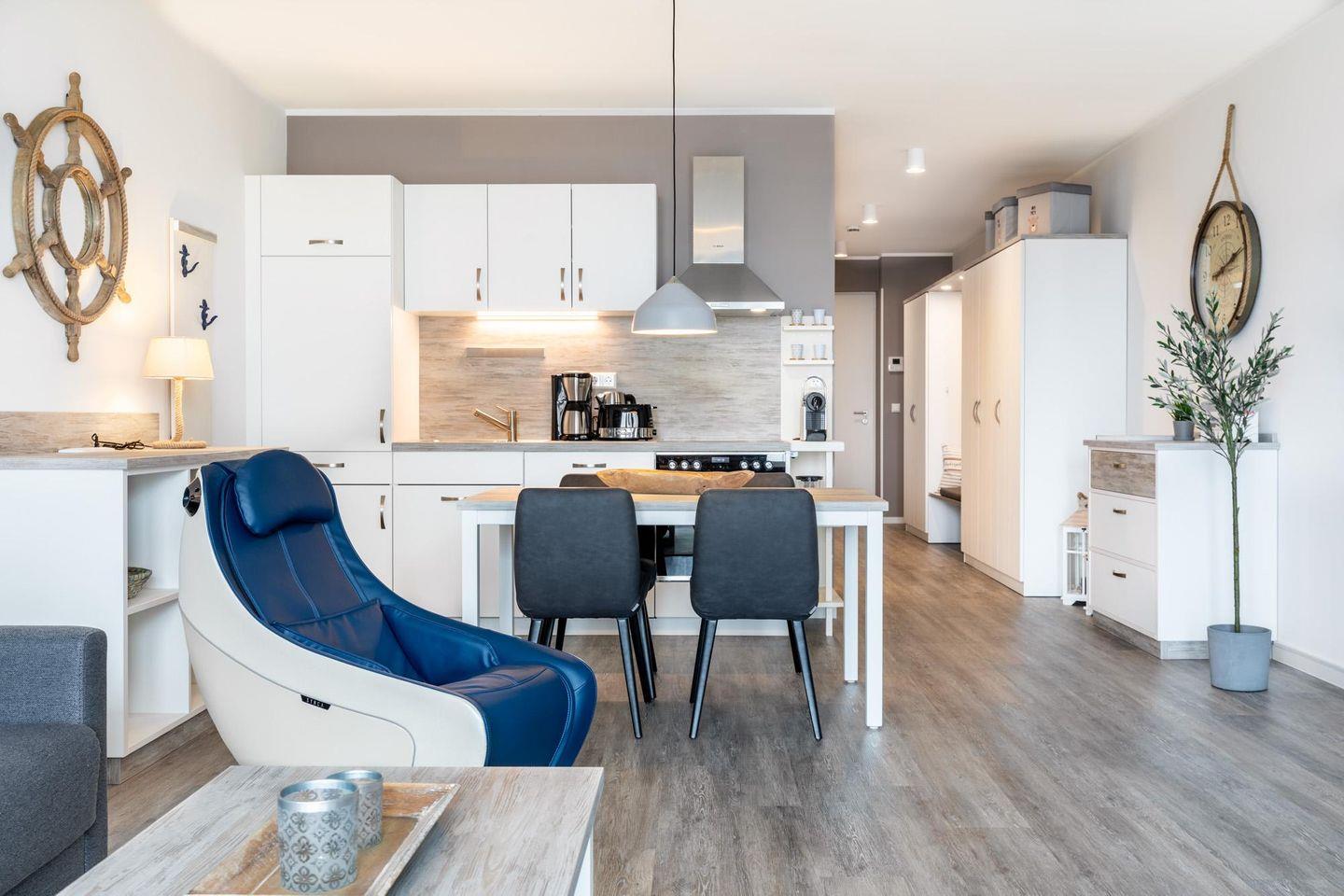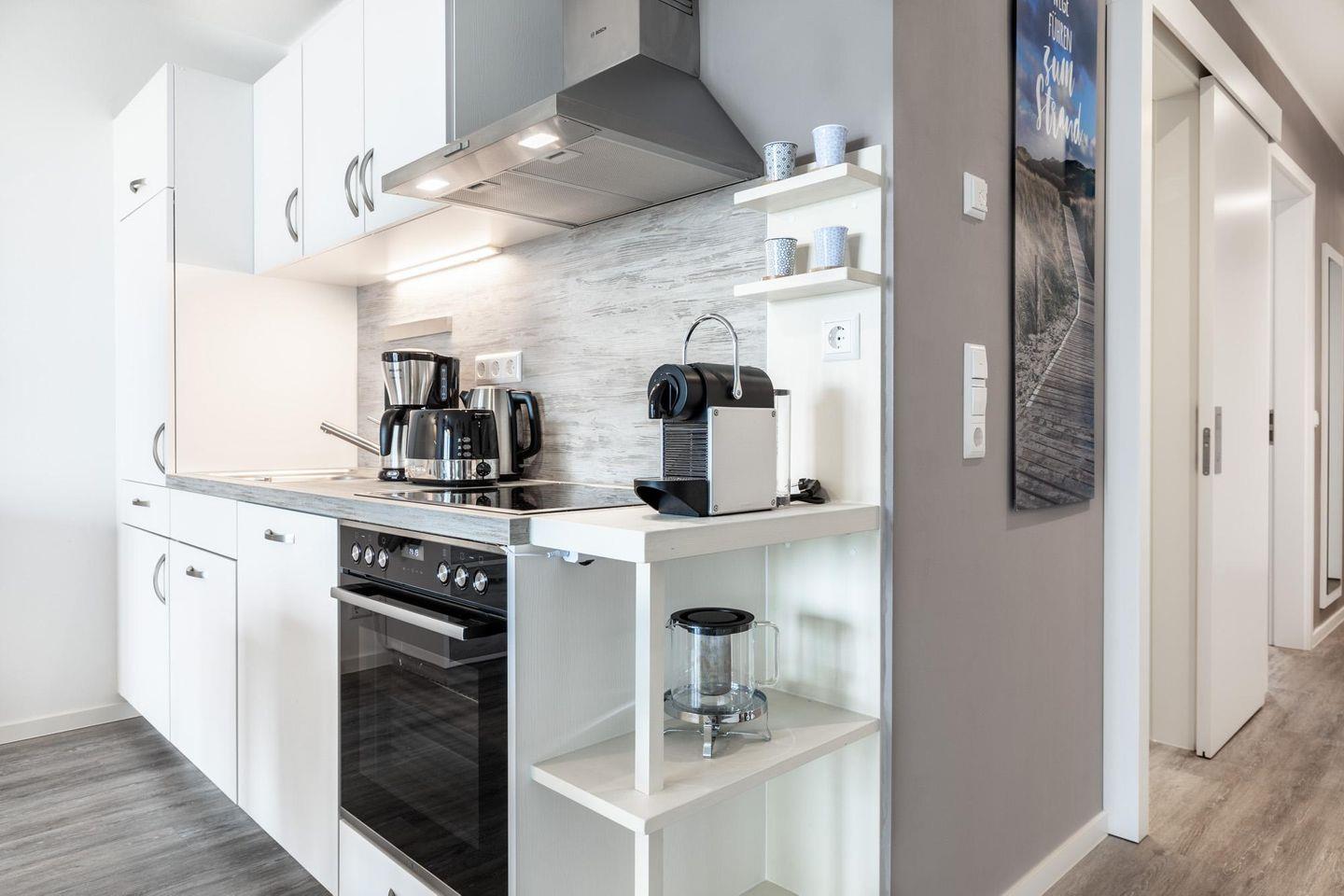 Das lichtdurchflutete und familienfreundliche Nichtraucher-Apartment ist barrierearm und verfügt über Fußbodenheizung, sonnenschutzverglaste und bodentiefe Fensterflächen, kostenfreies WLAN und eine voll ausgestattete offene Küche mit Geschirrspüler, Kühlschrank und Gefrierfach, Kaffeefilter- und Kaffeekapselmaschine (Nespresso), Toaster, Wasserkocher, Herd mit Glaskeramikkochfeld und Backofen mit Schnellaufheizfunktion.