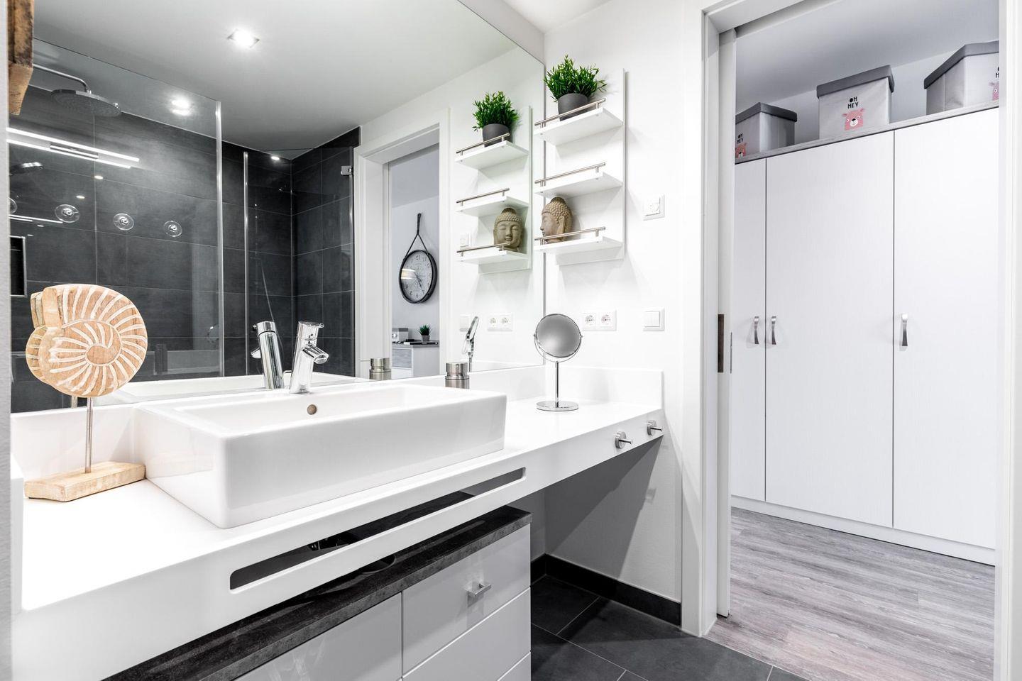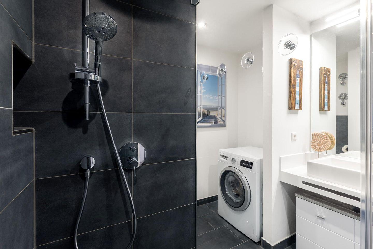Im modern-behaglichen Wohn-Essbereich befindet sich eine 360 Grad Soundanlage von Teufel, eine Doppelschlafcouch (1,60 x 1,95 m), ein großer 4K Smart-TV (52 Zoll) sowie Gesellschaftsspiele und eine Büchertauschbörse. Hier laden auch der exklusive kostenfreie Massagesessel und der hochwertige Elektrokamin mit Knisterfunktion zum Entspannen ein. Das separate Schlafzimmer bietet hohen Schlafkomfort durch zwei moderne Boxspringbetten (0,90 x 2,00 m) und ist mit einem weiteren Flatscreen-TV (40 Zoll) sowie Kleiderschrank und Sitz-/Kofferbank ausgestattet. Das stilvolle Badezimmer beinhaltet eine ebenerdige Regendusche, ein WC, einen Waschtisch mit Unterschrank und Föhn, einen Handtuchheizkörper und Fußbodenheizung. Das Apartment verfügt zudem über eine eigene Waschmaschine, einen Wäscheständer, Bügeleisen und Bügelbrett - ideal für Familien und den längeren Aufenthalt. Zur Wohnung gehört ein abschließbarer, privater Kellerraum, der euch zur Verfügung steht - hier könnt ihr eure Koffer, Sportgeräte etc. sicher verwahren.
