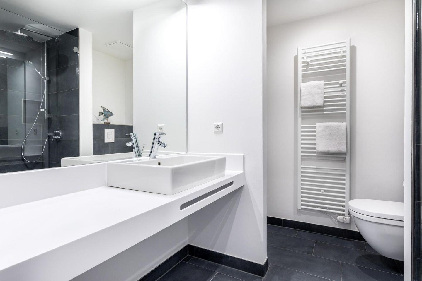 Im modern-behaglichen Wohn-Essbereich befindet sich eine Doppelschlafcouch (1,60 x 1,95 m) und ein großer Flatscreen-TV (43 Zoll). Das separate, nach Nordwesten gelegene Schlafzimmer bietet hohen Schlafkomfort durch zwei moderne Boxspringbetten (0,90 x 2,00 m) und ist mit einem weiteren Flatscreen-TV (40 Zoll) sowie Kleiderschrank und Sitz-/Kofferbank ausgestattet. Das stilvolle Badezimmer verfügt über eine ebenerdige Regendusche, WC, , Kosmetikspiegel, Waschtisch mit Föhn, Handtuchheizkörper und Fußbodenheizung.