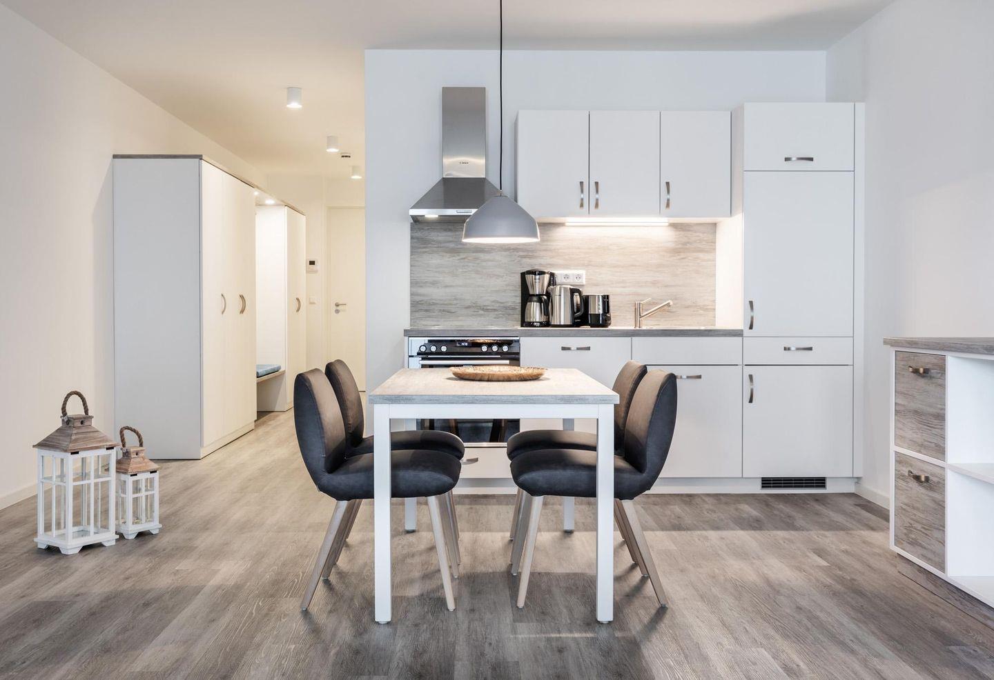 Das lichtdurchflutete und familienfreundliche Nichtraucher-Apartment ist barrierearm und verfügt über Fußbodenheizung, sonnenschutzverglaste und bodentiefe Fensterflächen, kostenfreies WLAN und eine voll ausgestattete offene Küche mit Geschirrspüler, Kühlschrank und Gefrierfach, Eierkocher, Stabmixer, Kaffeemaschine, Toaster, Wasserkocher, Herd mit Glaskeramikkochfeld und Backofen.