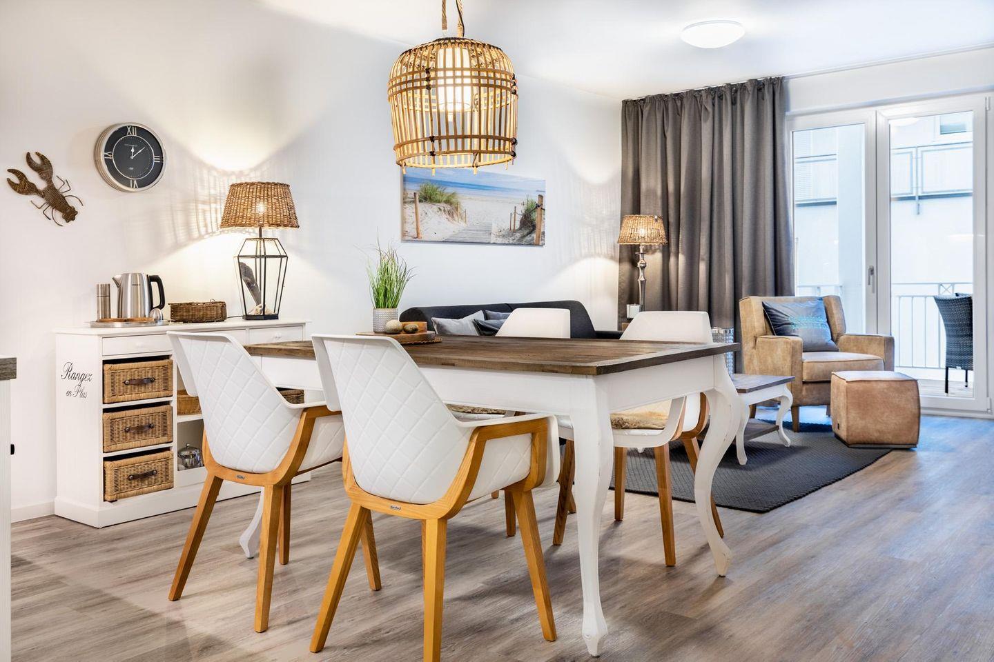 Das 58 m² große 2-Zimmer Apartment ist für bis zu 4 Personen geeignet. Besonders hervorzuheben ist der überdachte Balkon in Ost-Lage; hier genießt ihr das milde Meeresklima schon in der Morgensonne. Euer Vierbeiner ist hier herzlich willkommen!