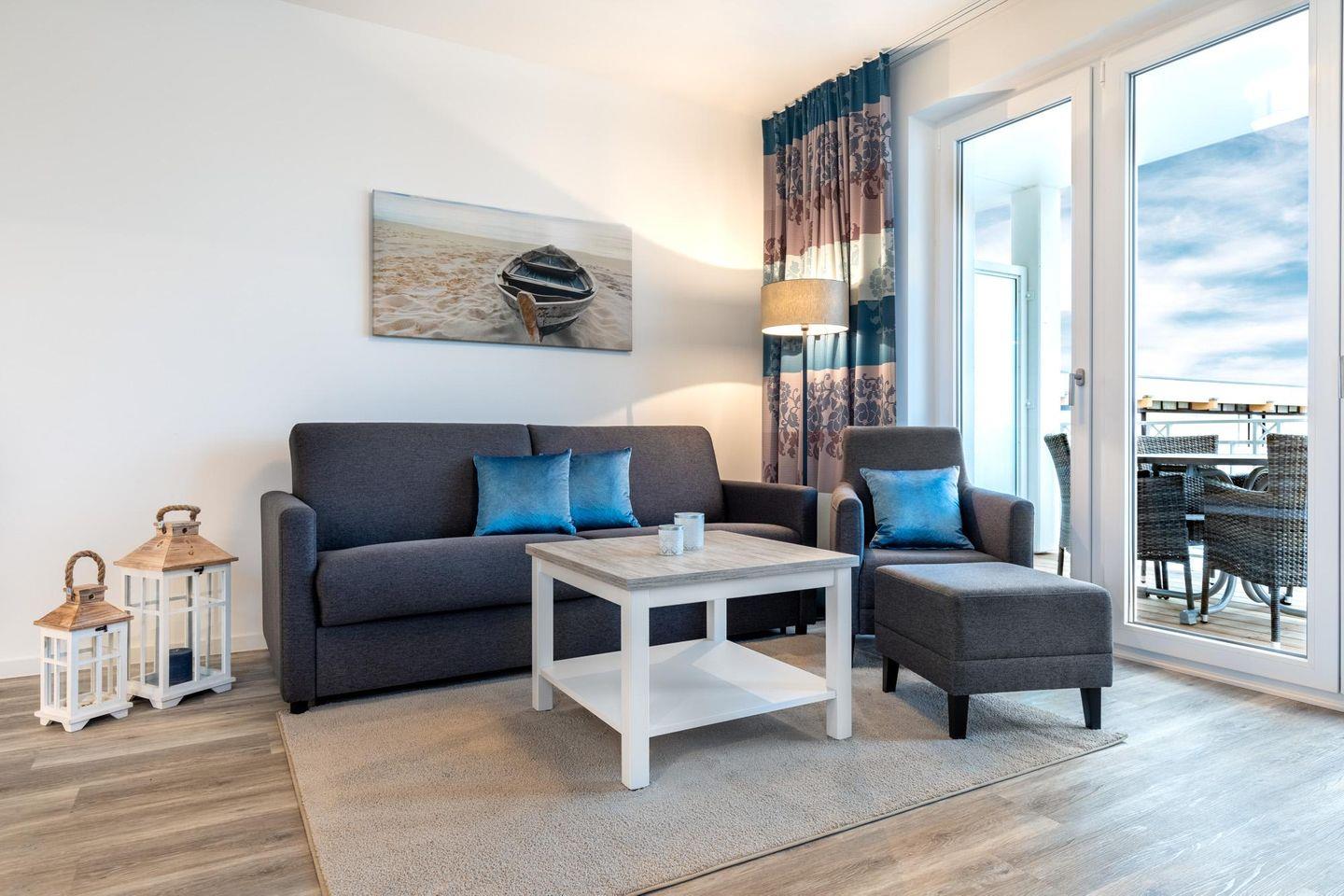 Entspannte und sonnige Stunden mit seitlichem Blick auf die Ostsee verbringt ihr auf dem überdachten und mit Gartenmöbeln ausgestatteten Balkon in Süd-West-Lage. Der Balkon ist vom Wohnbereich aus zugänglich. Ein Kinderbett kann gegen Entgelt im Wohnbereich aufgestellt werden und auf Wunsch könnt ihr einen Hochstuhl hinzubuchen. Haustiere sind in diesem Apartment herzlich willkommen!