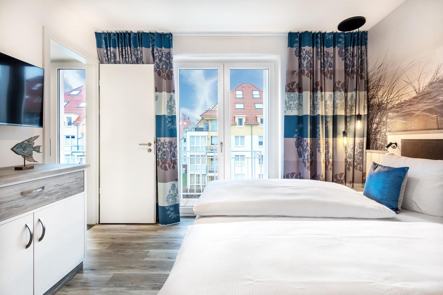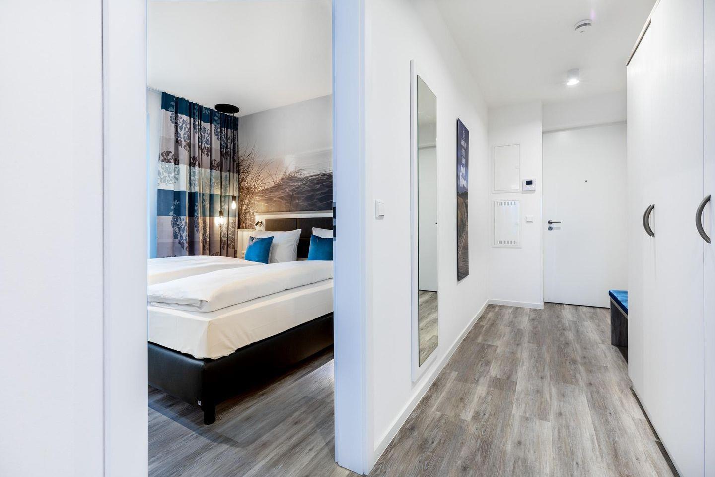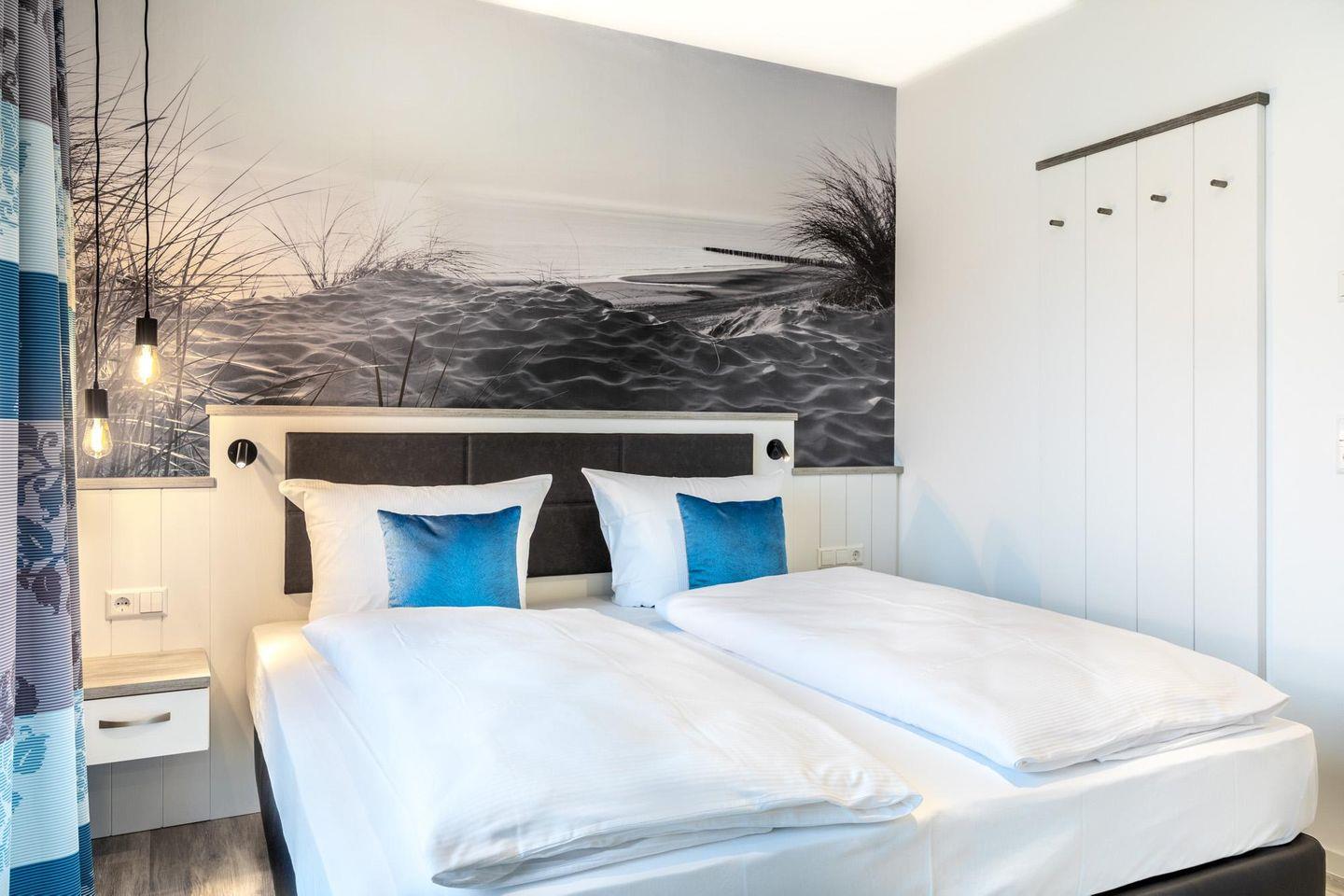 Im modern-behaglichen Wohn-Essbereich befindet sich eine Doppelschlafcouch (1,60 x 1,95 m) und ein großer Flatscreen-TV (43 Zoll). Das separate, nach Nordwesten gelegene Schlafzimmer bietet hohen Schlafkomfort durch zwei moderne Boxspringbetten (0,90 x 2,00 m) und ist mit einem weiteren Flatscreen-TV (40 Zoll) ausgestattet. Im Flur befinden sich Kleiderschrank und Sitz-/Kofferbank. Das stilvolle Badezimmer verfügt über eine ebenerdige Regendusche, WC, Waschtisch mit Föhn, Handtuchheizkörper und Fußbodenheizung und ist mit dem benachbarten Schlafzimmer direkt verbunden.