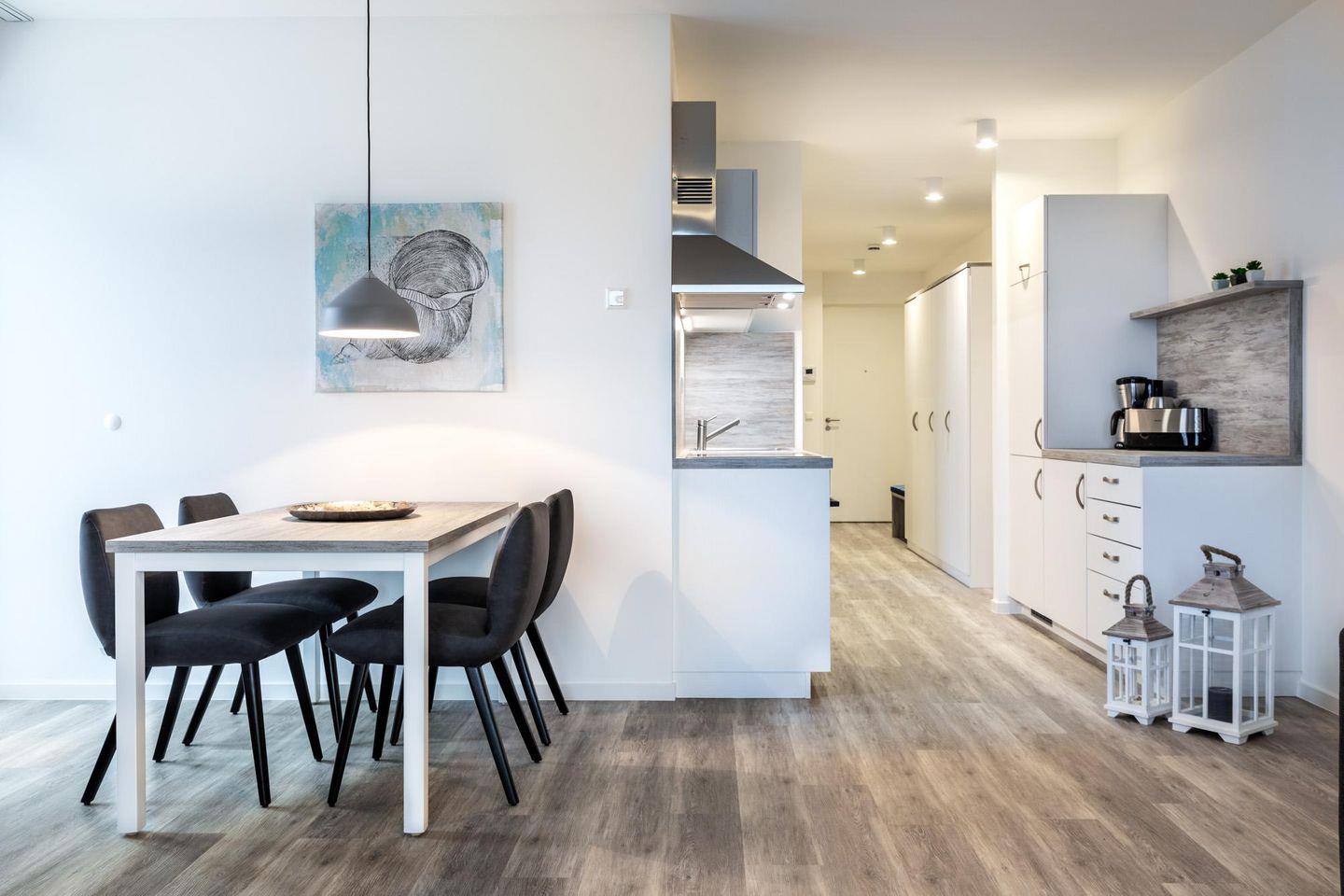 Das lichtdurchflutete und familienfreundliche Nichtraucher-Apartment ist barrierearm und verfügt über Fußbodenheizung, sonnenschutzverglaste und bodentiefe Fensterflächen, kostenfreies WLAN und eine voll ausgestattete offene Küche mit Geschirrspüler, Kühlschrank und Gefrierfach, Kaffeemaschine, Toaster, Wasserkocher, Herd mit Glaskeramikkochfeld und Backofen.