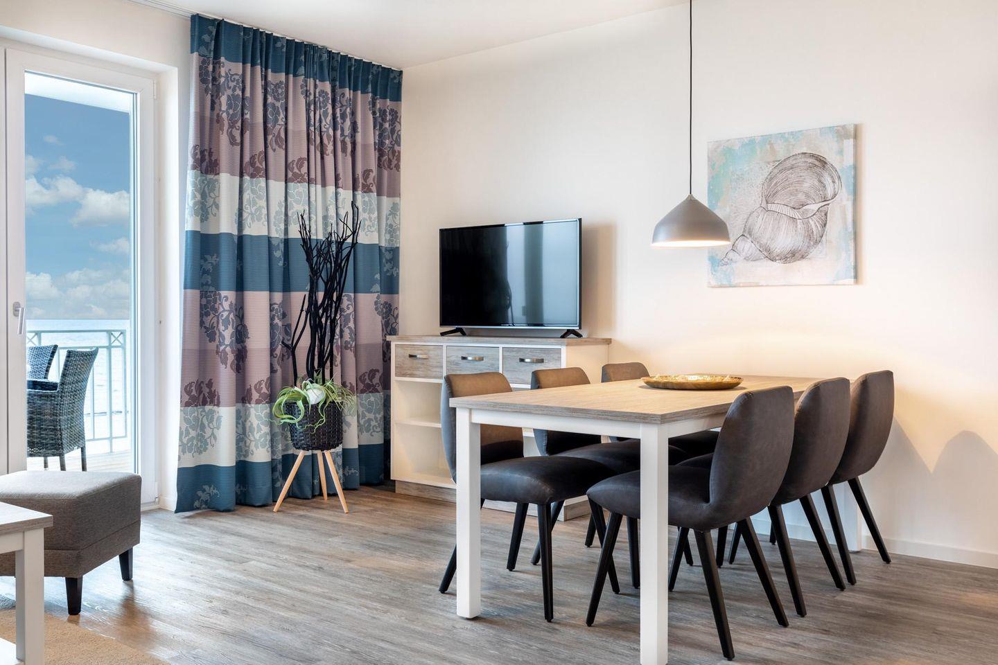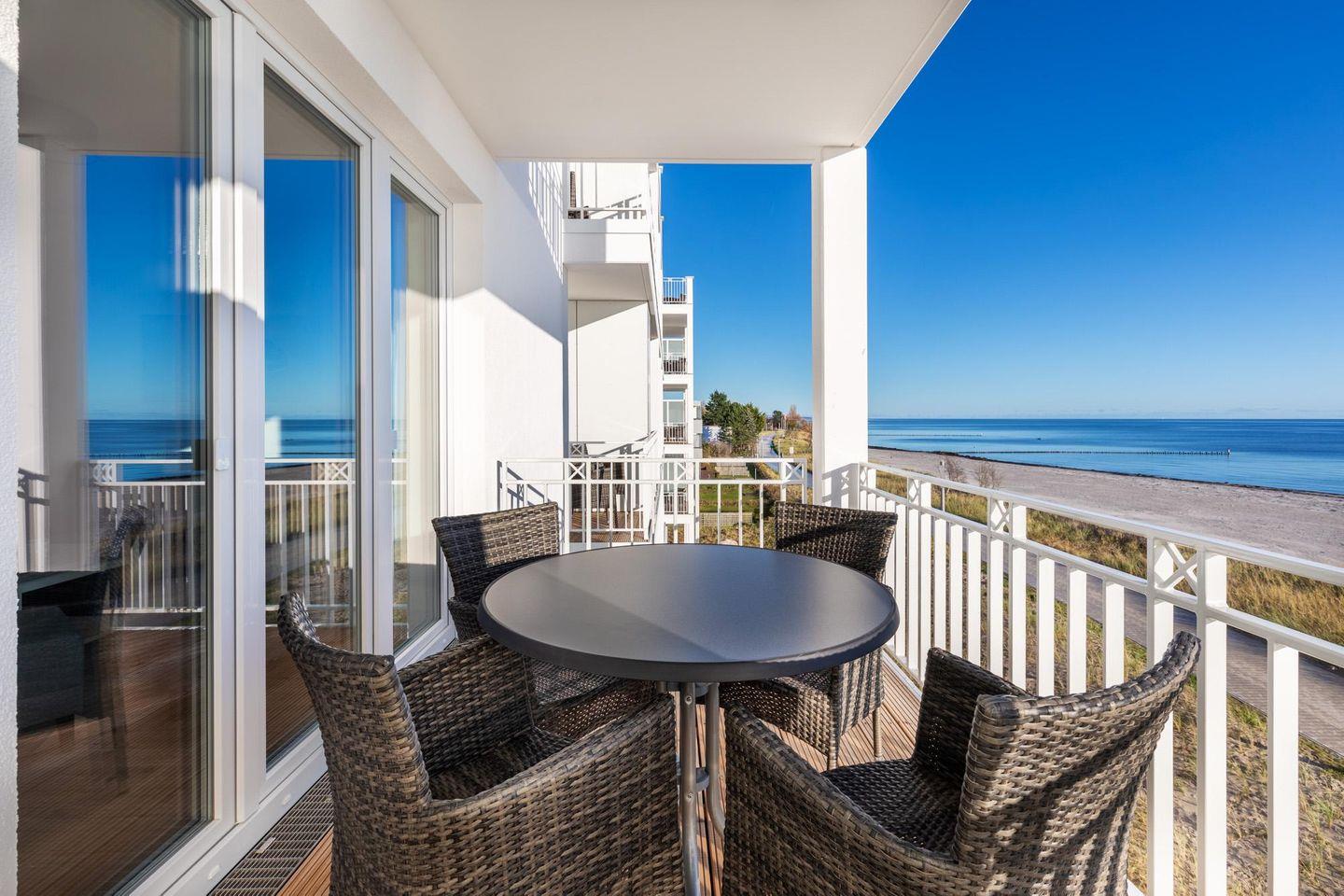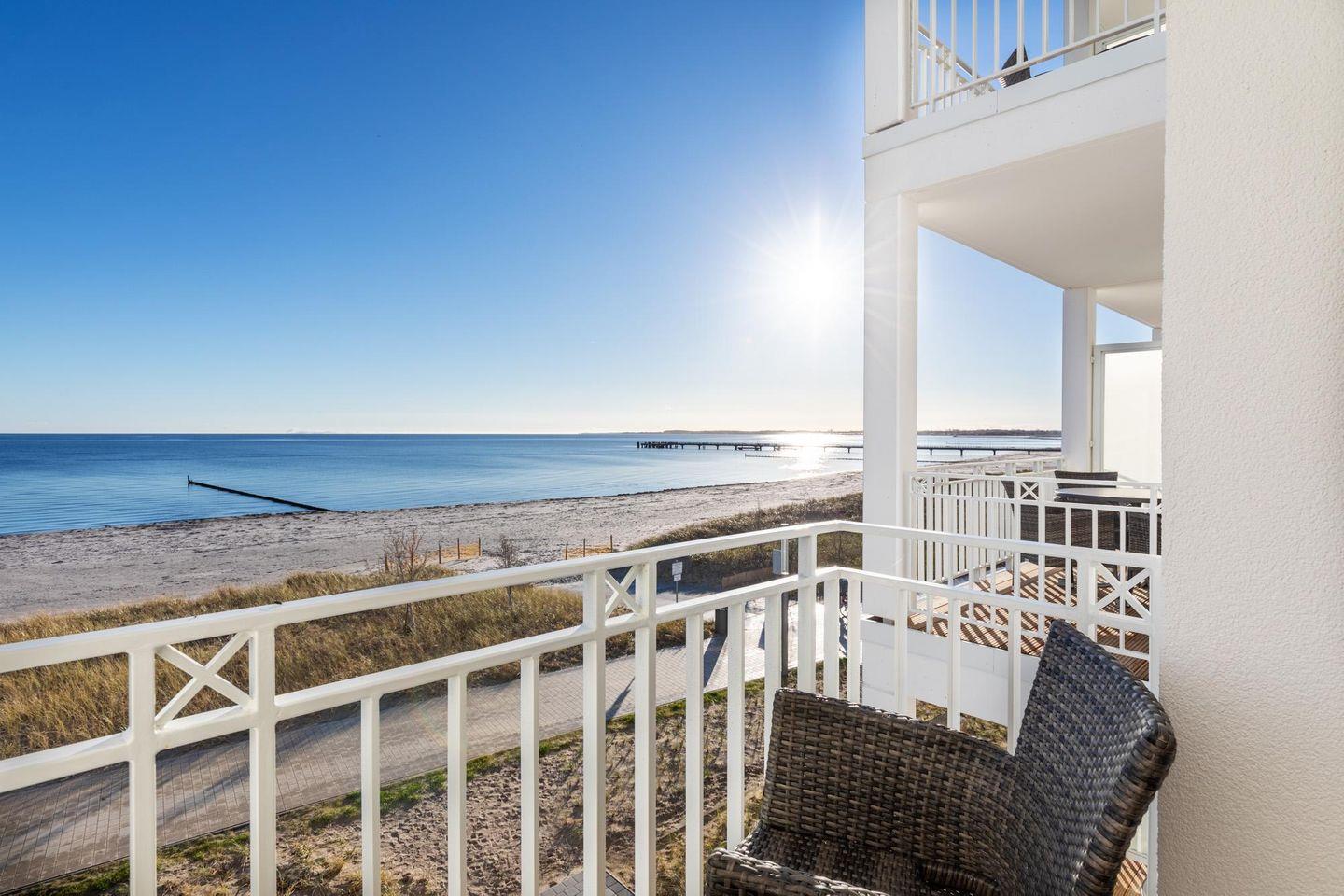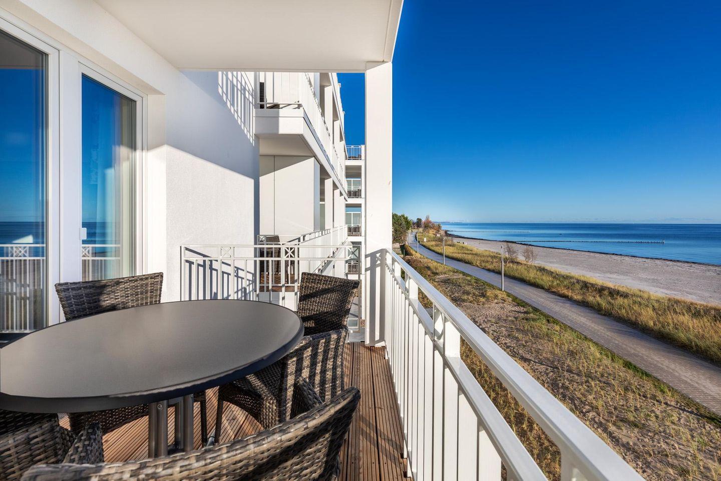 Das 66 m² große 3-Zimmer Apartment ist für bis zu 6 Personen geeignet. Besonders hervorzuheben sind die sonnigen und überdachten Balkone in Süd-Ost-Lage; hier genießt ihr einen wunderschönen Blick auf die Ostsee und das Strandleben schon in der Morgensonne.