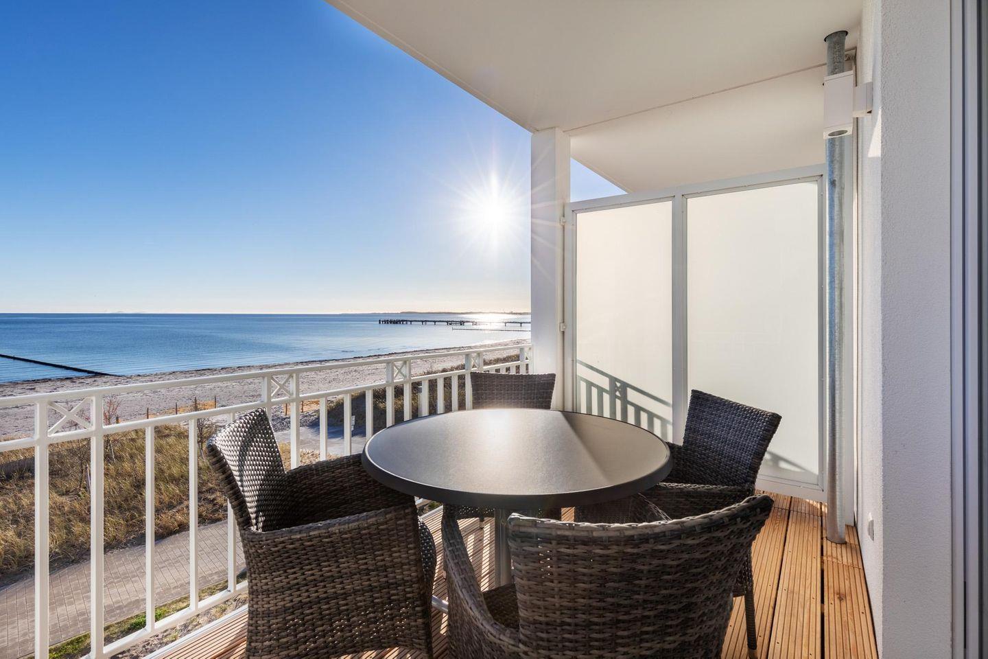 Entspannte und sonnige Stunden mit Panoramablick auf die See verbringt ihr auf dem mit Gartenmöbeln ausgestatteten Balkon in Süd-Ost-Lage. Der Balkon ist vom Wohnbereich aus begehbar. Hunde sind in diesem Apartment herzlich willkommen!
