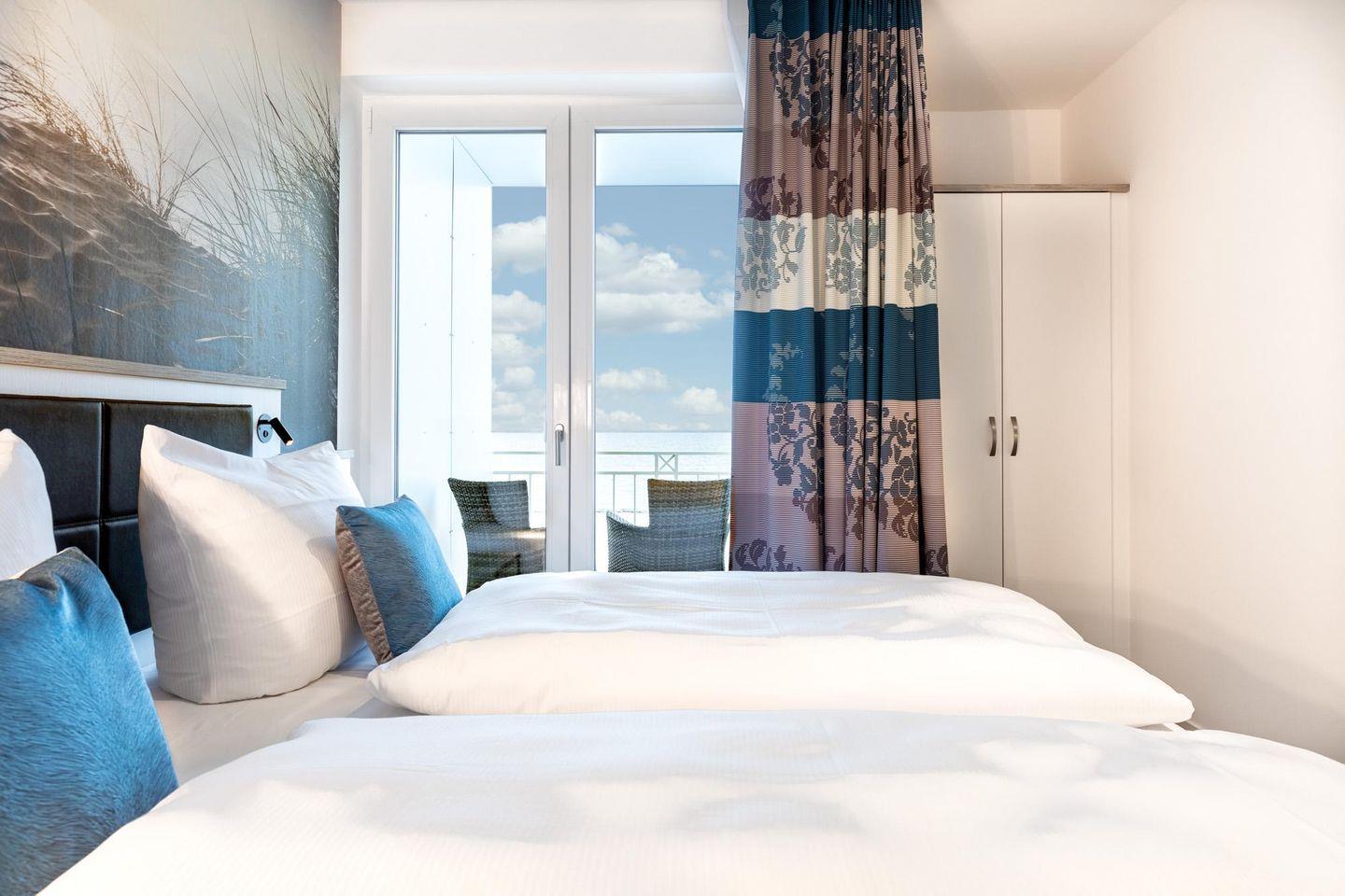 Im modern-behaglichen Wohn-Essbereich befindet sich eine Doppelschlafcouch (1,60 x 1,95 m) und ein großer Flatscreen-TV (43 Zoll). Zwei separate Schlafzimmer bieten hohen Schlafkomfort durch moderne Boxspringbetten mit einem Doppelbett (1,80 x 2,00 m) und sind mit jeweils einem Flatscreen-TV (40 Zoll) und Kleiderschrank ausgestattet. Eines der Schlafzimmer verfügt über einen eigenen, kleinen Balkon mit Meerblick. Bitte beachtet, dass sich im zweiten Schlafzimmer ein Brandschutzfenster befindet, dass sich nicht öffnen lässt. Es gibt jedoch eine spezielle Lüftungsanlage, über die stufenweise regulierbar Frischluft zugeführt werden kann.