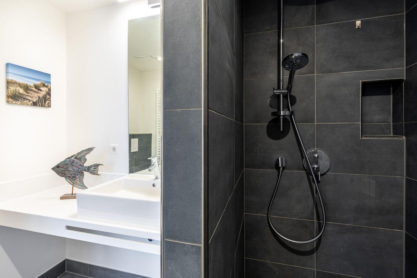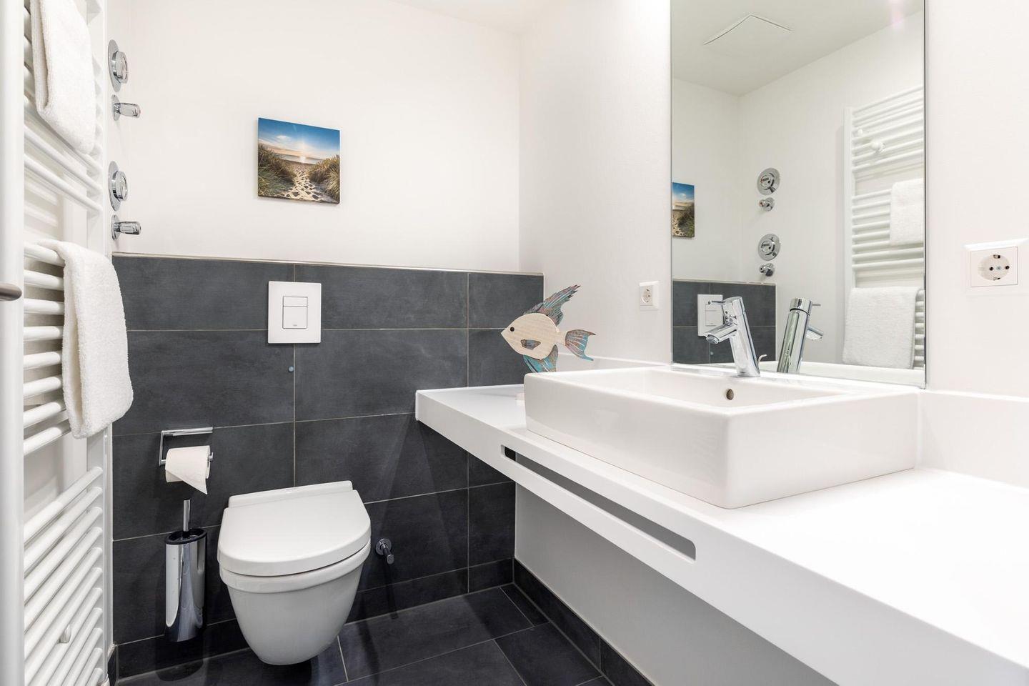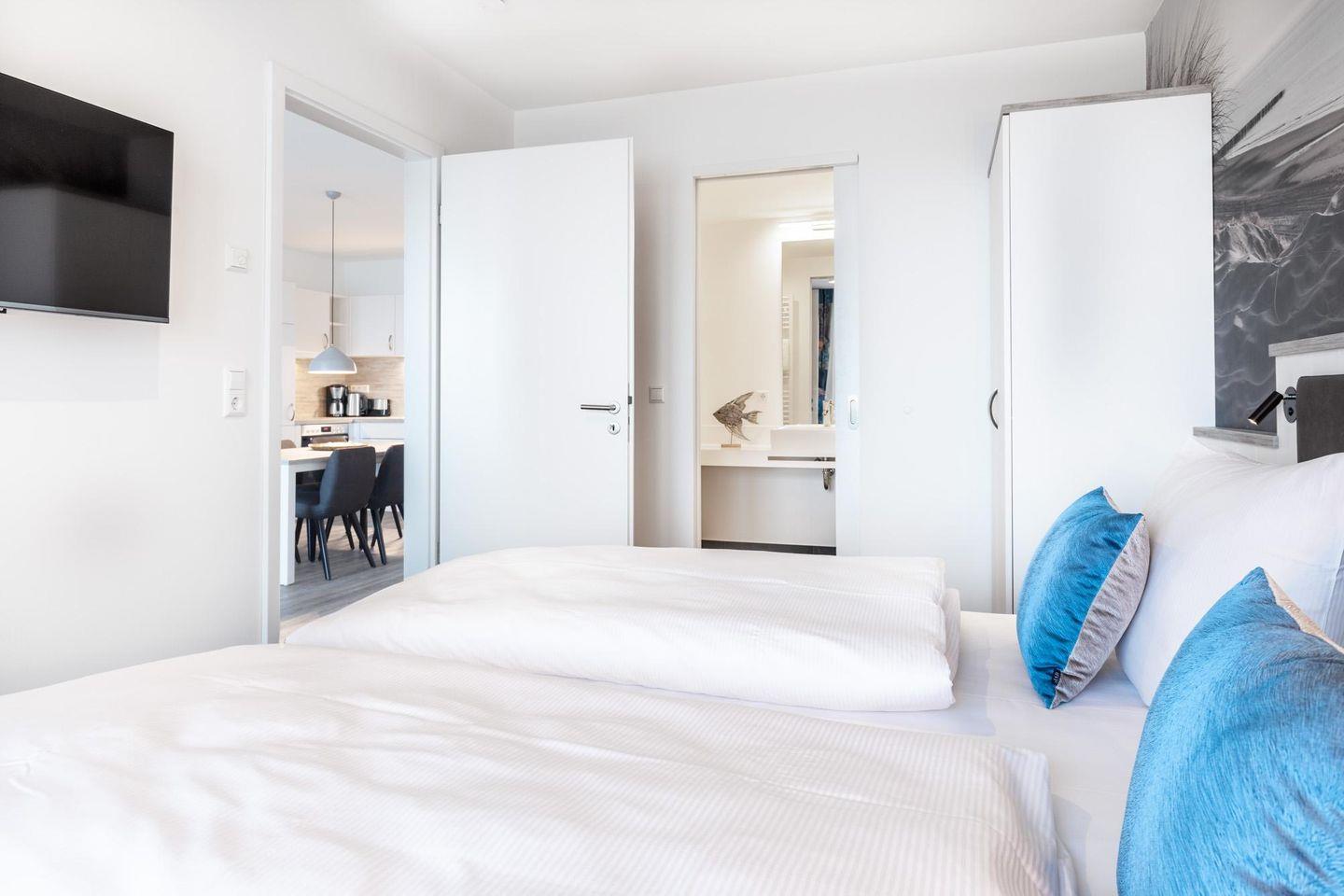 Im modern-behaglichen Wohn-Essbereich befindet sich eine Doppelschlafcouch (1,60 x 1,95 m) und ein großer SMART-TV (65 Zoll). Beide separaten Schlafzimmer bieten hohen Schlafkomfort durch jeweils zwei moderne Boxspringbetten (0,90 x 2,00 m) und sind mit jeweils einem Flatscreen-TV (40 Zoll) und Kleiderschrank ausgestattet. Zwei stilvolle Badezimmer bieten jeweils eine ebenerdige Regendusche, WC, Waschtisch mit Föhn, Handtuchheizkörper und Fußbodenheizung. So beginnt ihr euren Urlaubstag schon morgens ganz entspannt.