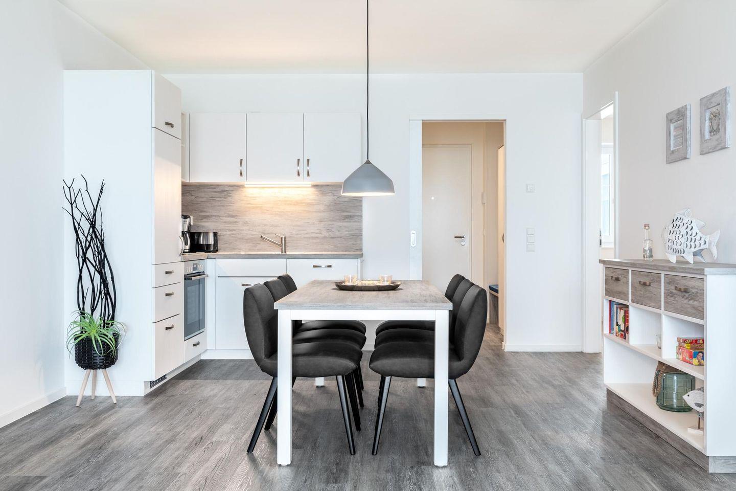 Das lichtdurchflutete und familienfreundliche Nichtraucher-Apartment ist barrierearm und verfügt über Fußbodenheizung, sonnenschutzverglaste und bodentiefe Fensterflächen, kostenfreies WLAN und eine voll ausgestattete offene Küche mit Geschirrspüler, Kühlschrank und Gefrierfach, Kaffeemaschine, Toaster, Wasserkocher, Herd mit Glaskeramikkochfeld und Backofen.