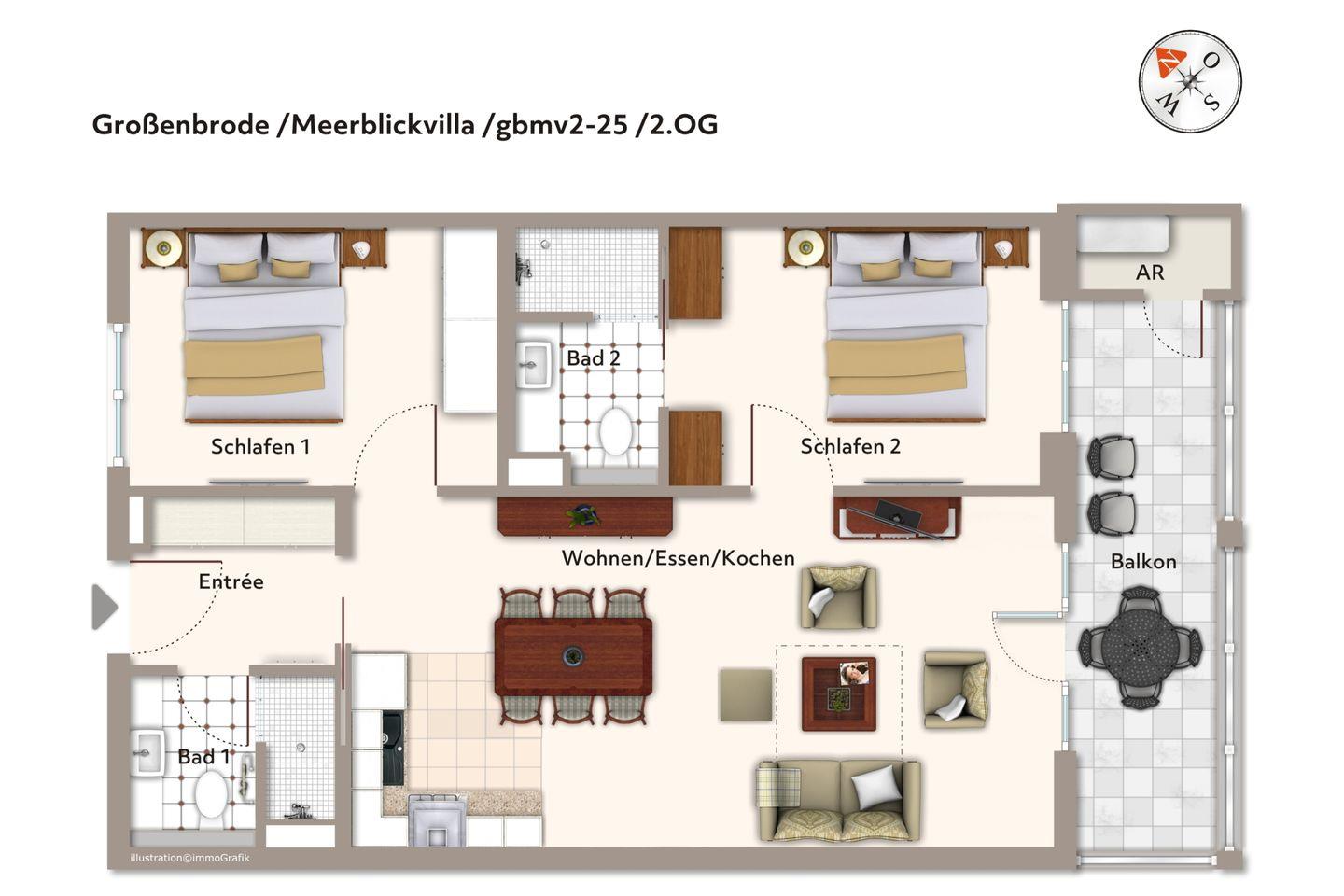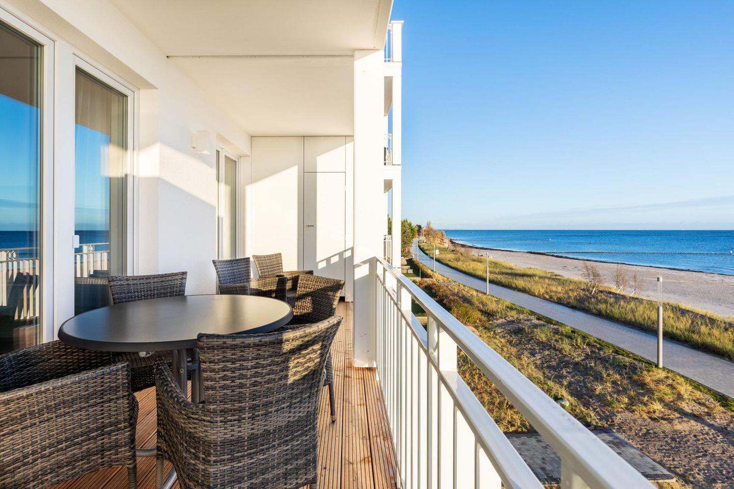Entspannte und sonnige Stunden mit Panoramablick auf die See verbringt ihr auf dem großzügigen 10 qm großen Balkon in Süd-Ost-Lage. Der Balkon ist mit Gartenmöbeln ausgestattet und sowohl vom Wohnbereich als auch von einem der Schlafzimmer aus begehbar.