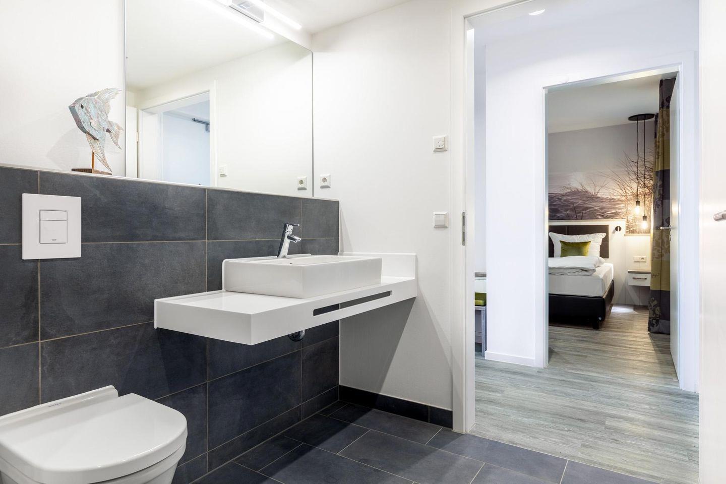 Das stilvolle Badezimmer bietet eine ebenerdige Regendusche, WC, Waschtisch mit Föhn, Handtuchheizkörper und Fußbodenheizung. Des Weiteren beinhaltet die Ferienwohnung ein zweites WC mit Waschbecken.