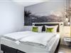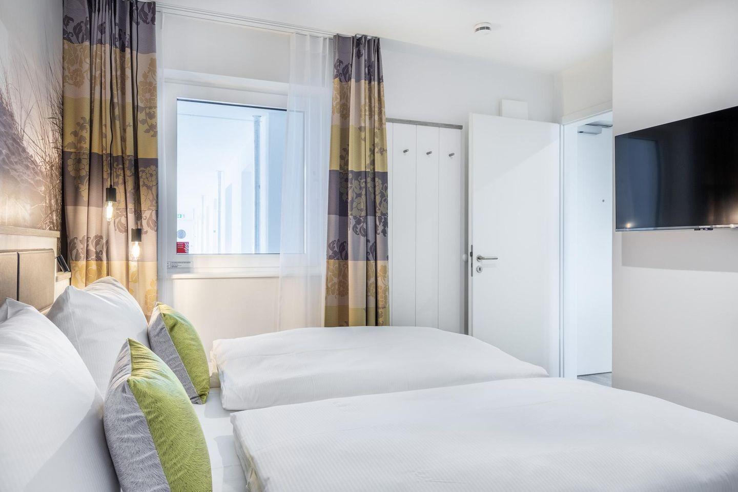 Im modern-behaglichen Wohn-Essbereich befindet sich eine Doppelschlafcouch (1,60 x 1,95 m) und ein großer Flatscreen-TV (43 Zoll). Zwei separate Schlafzimmer bieten hohen Schlafkomfort durch moderne Boxspringbetten mit einem Doppelbett (1,80 x 2,00 m) und sind mit jeweils einem Flatscreen-TV (40 Zoll) und Kleiderschrank ausgestattet. Eines der Schlafzimmer verfügt über einen eigenen, kleinen Balkon mit Meerblick. Bitte beachtet, dass sich im zweiten Schlafzimmer ein Brandschutzfenster befindet, dass sich nicht öffnen lässt. Es gibt jedoch eine spezielle Lüftungsanlage, über die stufenweise regulierbar Frischluft zugeführt werden kann.