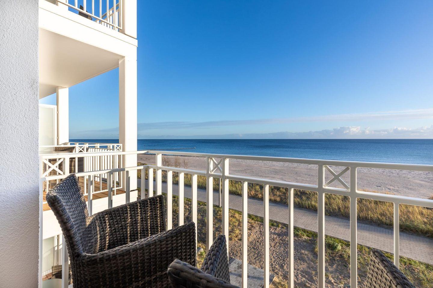 Entspannte und sonnige Stunden mit Panoramablick auf die See verbringt ihr auf dem mit Gartenmöbeln ausgestatteten Balkon in Süd-Ost-Lage. Der Balkon ist vom Wohnbereich aus begehbar.