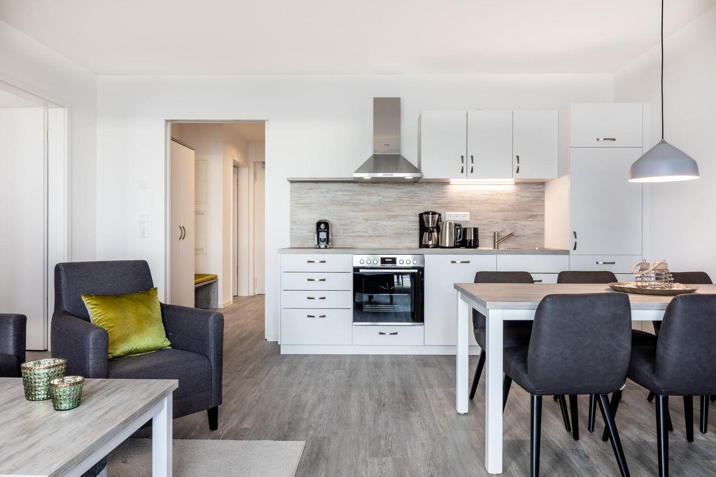 Das lichtdurchflutete und familienfreundliche Nichtraucher-Apartment ist barrierearm und verfügt über Fußbodenheizung, sonnenschutzverglaste und bodentiefe Fensterflächen, kostenfreies WLAN und eine voll ausgestattete offene Küche mit Geschirrspüler, Kühlschrank und Gefrierfach, Kaffeefilter- und Kaffeekapselmaschine (Nespresso), Toaster, Wasserkocher, Herd mit Glaskeramikkochfeld und Backofen.