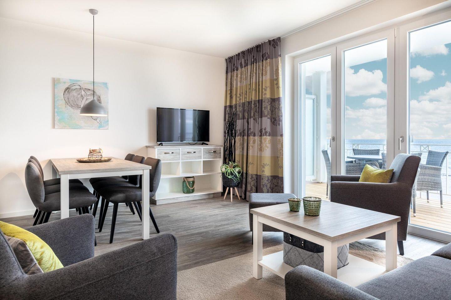 Das 66 m² große 3-Zimmer Apartment ist für bis zu 6 Personen geeignet. Besonders hervorzuheben sind die sonnigen und überdachten Balkone in Süd-Ost-Lage; hier genießt ihr einen wunderschönen Blick auf die Ostsee und das Strandleben schon in der Morgensonne.