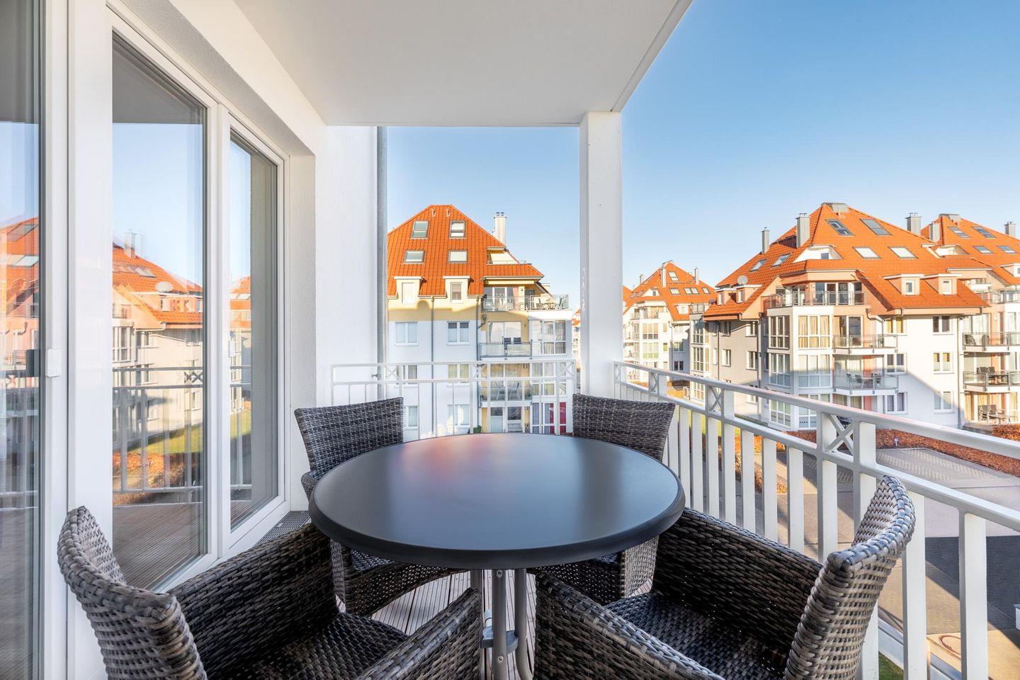 Entspannte Stunden mit seitlichem Meerblick verbringt ihr auf dem überdachten und mit Gartenmöbeln ausgestatteten Balkon in nordöstlicher Lage. Der Balkon ist vom Wohnbereich aus zugänglich.