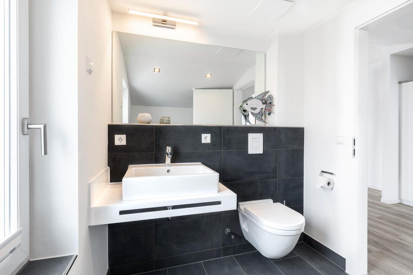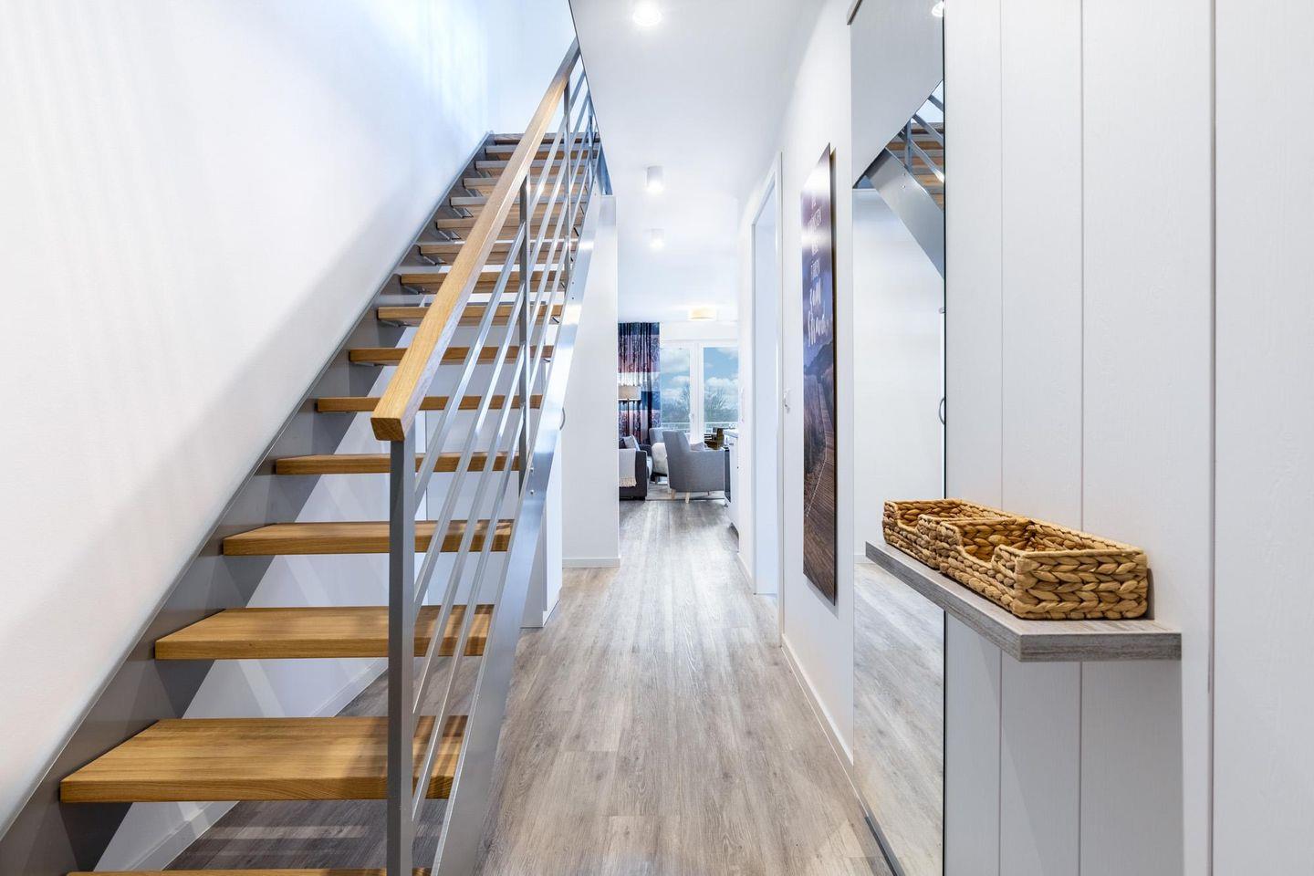 Über die Treppe im Entree gelangt ihr auf die großzügig konzipierte Wohnebene mit Galerie im Dachgeschoss. Hier befindet sich ein zweites Bad mit Badewanne, WC, Waschtisch mit Föhn, Handtuchheizkörper und Fußbodenheizung. Der Schlafbereich auf der Galerie verfügt ebenfalls über zwei modernen Boxspringbetten (0,90 x 2,00 m) und Flatscreen-TV (40 Zoll). Auch auf dieser Ebene befindet sich eine Art französischer Balkon, der fast über die ganze nordwestlich gelegene Seite verläuft.
