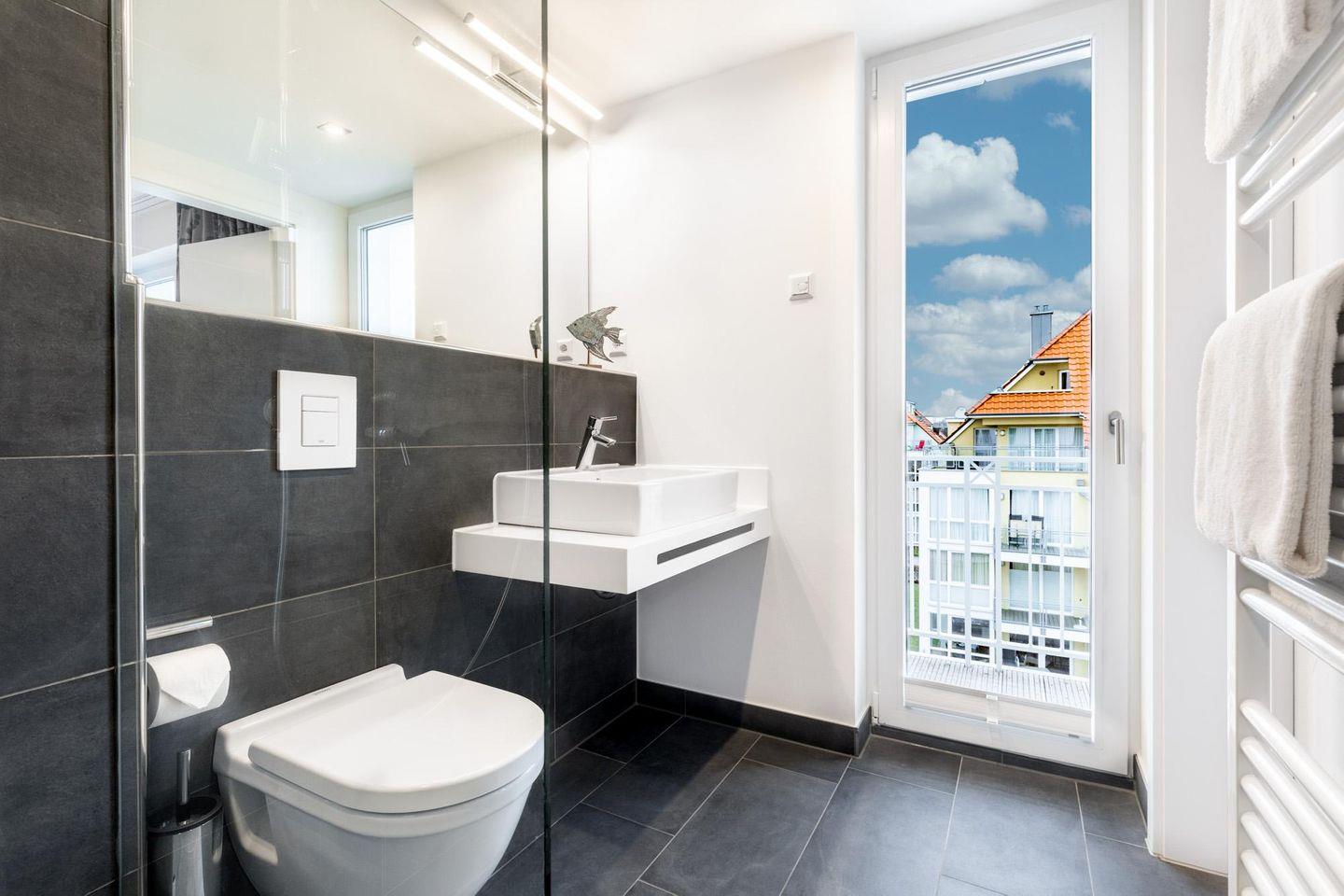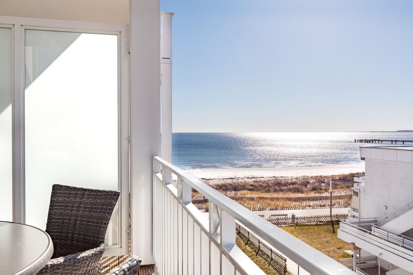 Entspannte und sonnige Stunden mit seitlichem Blick auf die Ostsee verbringt ihr auf dem überdachten und mit Gartenmöbeln ausgestatteten Balkon in Süd-West-Lage. Der Balkon ist vom Wohnbereich aus zugänglich. Durch den über die nordwestliche Seite verlaufenden Austritt - ähnlich einem französischen Balkon - ist das Apartment besonders lichtdurchflutet.