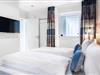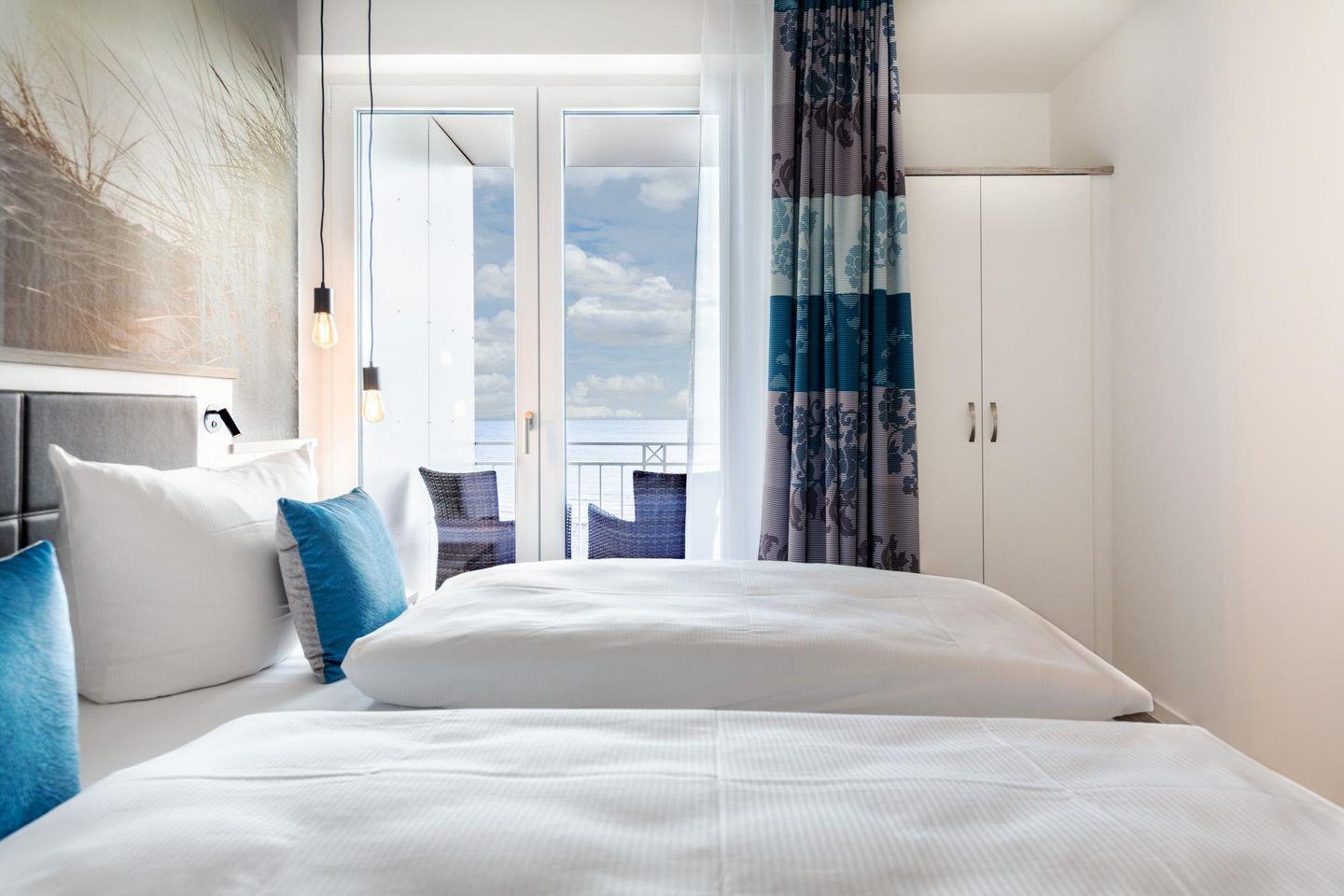 Im modern-behaglichen Wohn-Essbereich befindet sich eine Doppelschlafcouch (1,60 x 1,95 m) und ein großer Flatscreen-TV (43 Zoll). Zwei separate Schlafzimmer bieten hohen Schlafkomfort durch moderne Boxspringbetten mit einem Doppelbett (1,80 x 2,00 m) und sind mit jeweils einem Flatscreen-TV (40 Zoll) und Kleiderschrank ausgestattet. Eines der Schlafzimmer verfügt über einen eigenen, kleinen Balkon mit Meerblick. Bitte beachtet, dass sich im zweiten Schlafzimmer ein Brandschutzfenster befindet, dass sich nicht öffnen lässt. Es gibt jedoch eine spezielle Lüftungsanlage, über die stufenweise regulierbar Frischluft zugeführt werden kann.