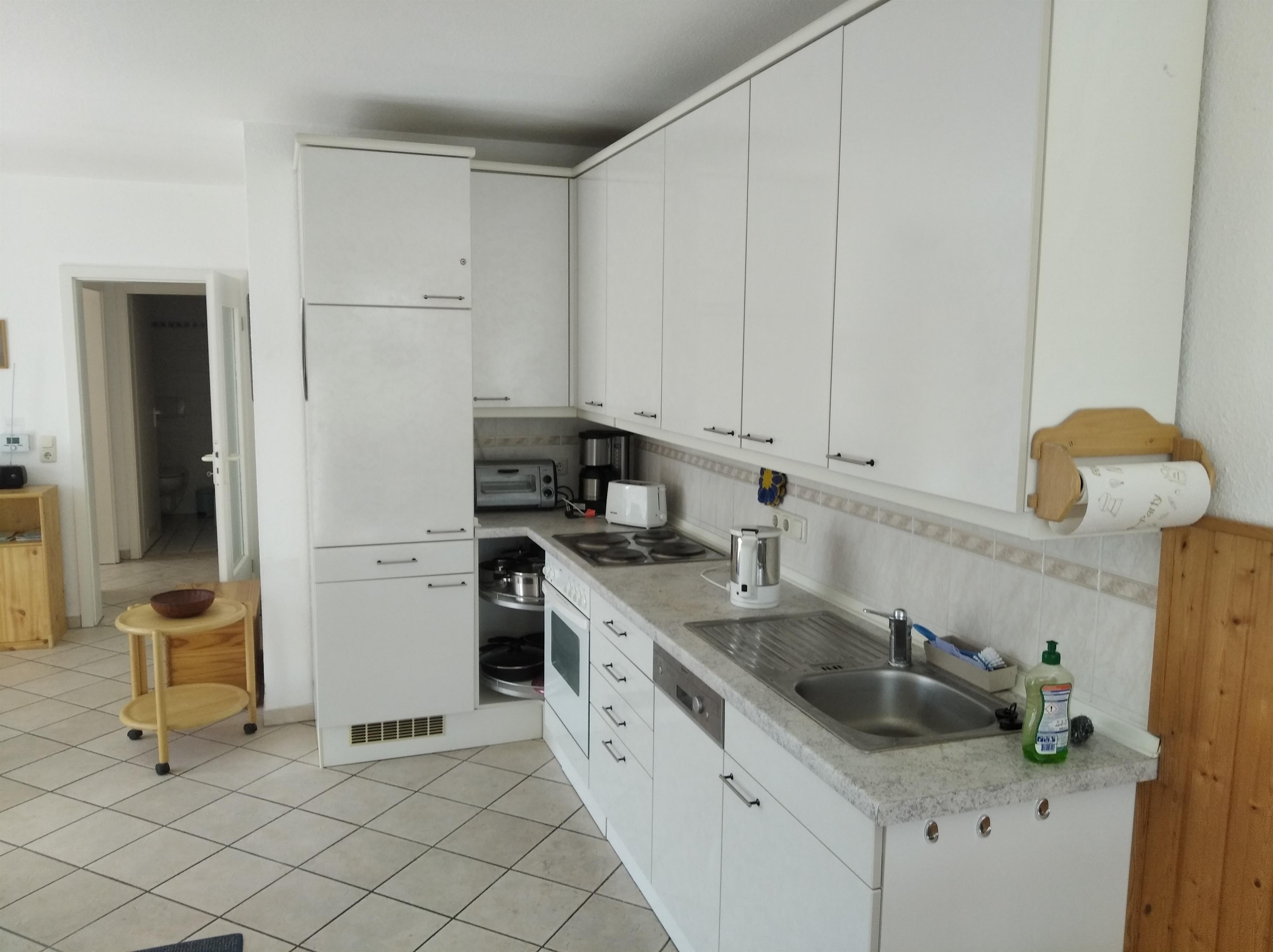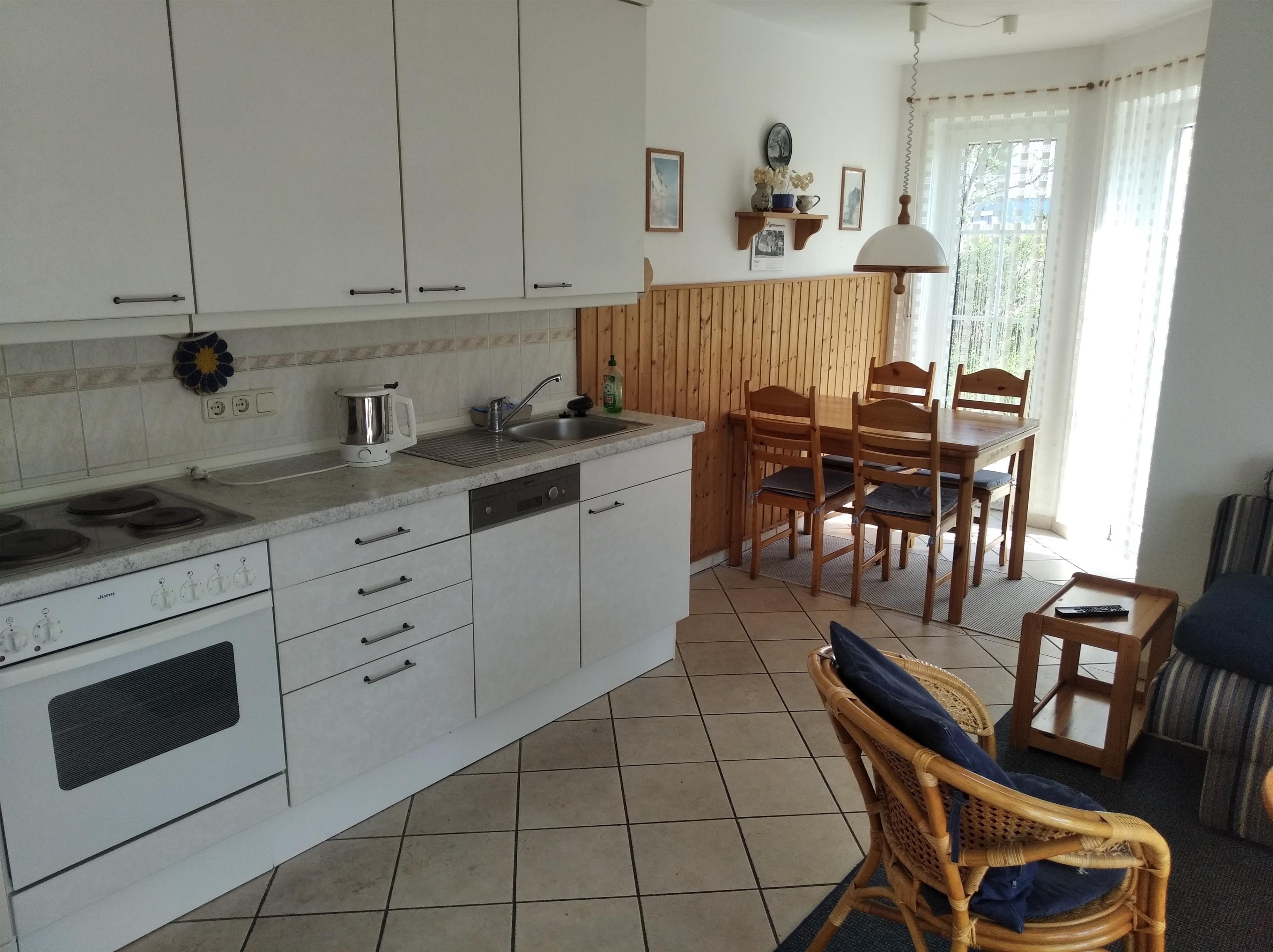 Richtige Urlaubsstimmung kommt auf der schönen Terrasse der Ferienwohnung auf. Die gut ausgestattete Küche besitzt unter anderem einen Kühlschrank, einen Herd zum Kochen und sogar eine Spülmaschine.