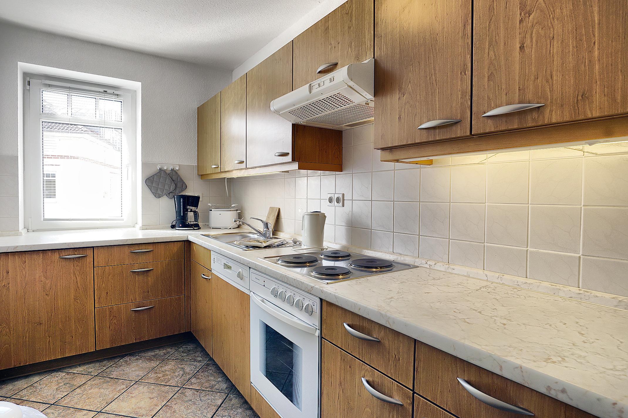 Die gut ausgestattete Küche besitzt unter anderem einen Toaster und eine Kaffeemaschine.