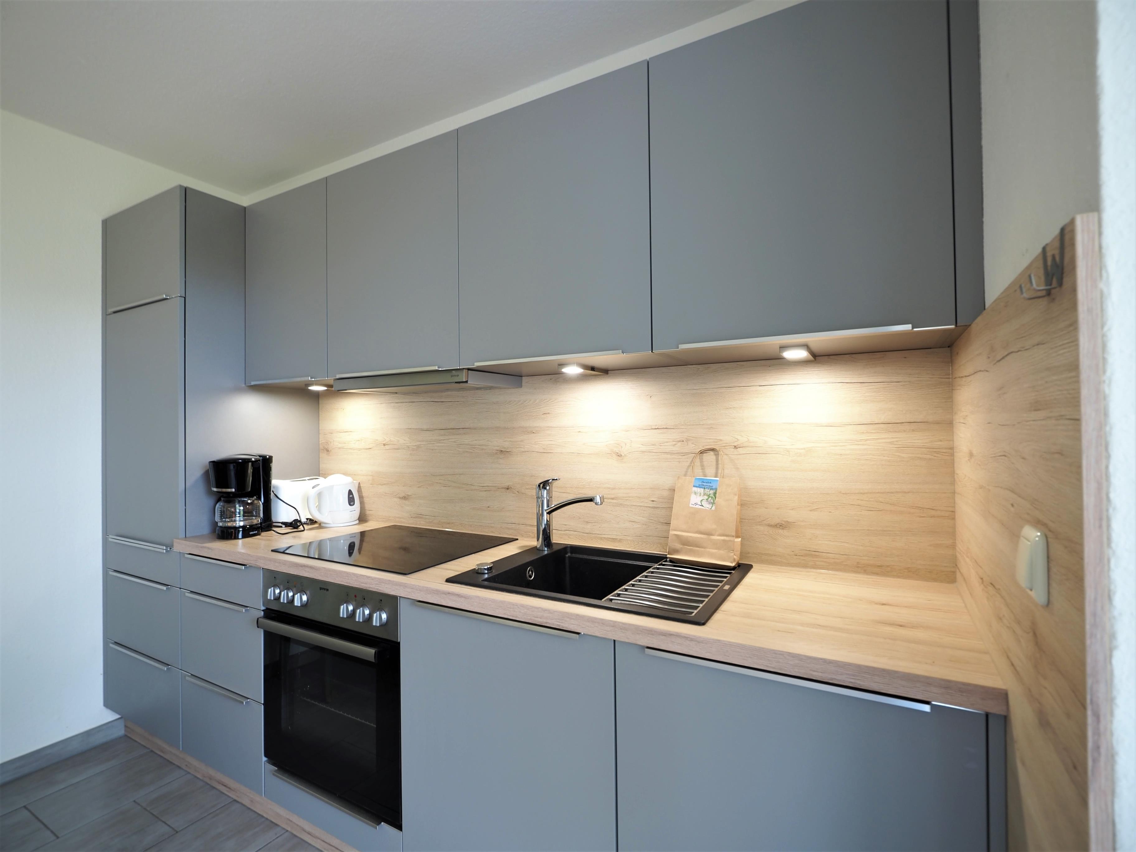 Die gut ausgestattete Küche besitzt unter anderem einen Kühlschrank, einen Herd zum Kochen und sogar eine Spülmaschine.
