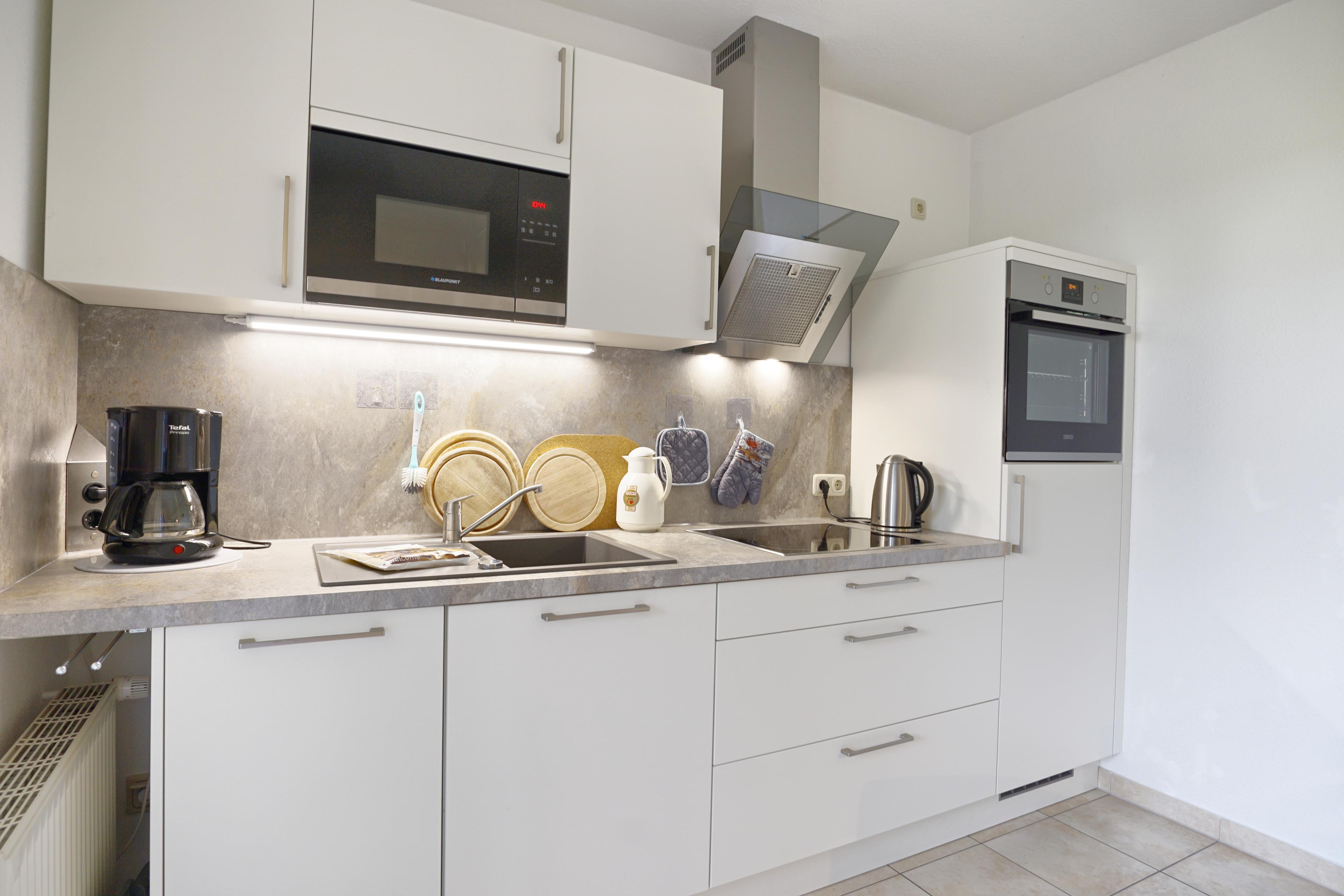 Ihnen stehen neben einem Kühlschrank auch eine Kaffeemaschine und eine Mikrowelle zur Verfügung.