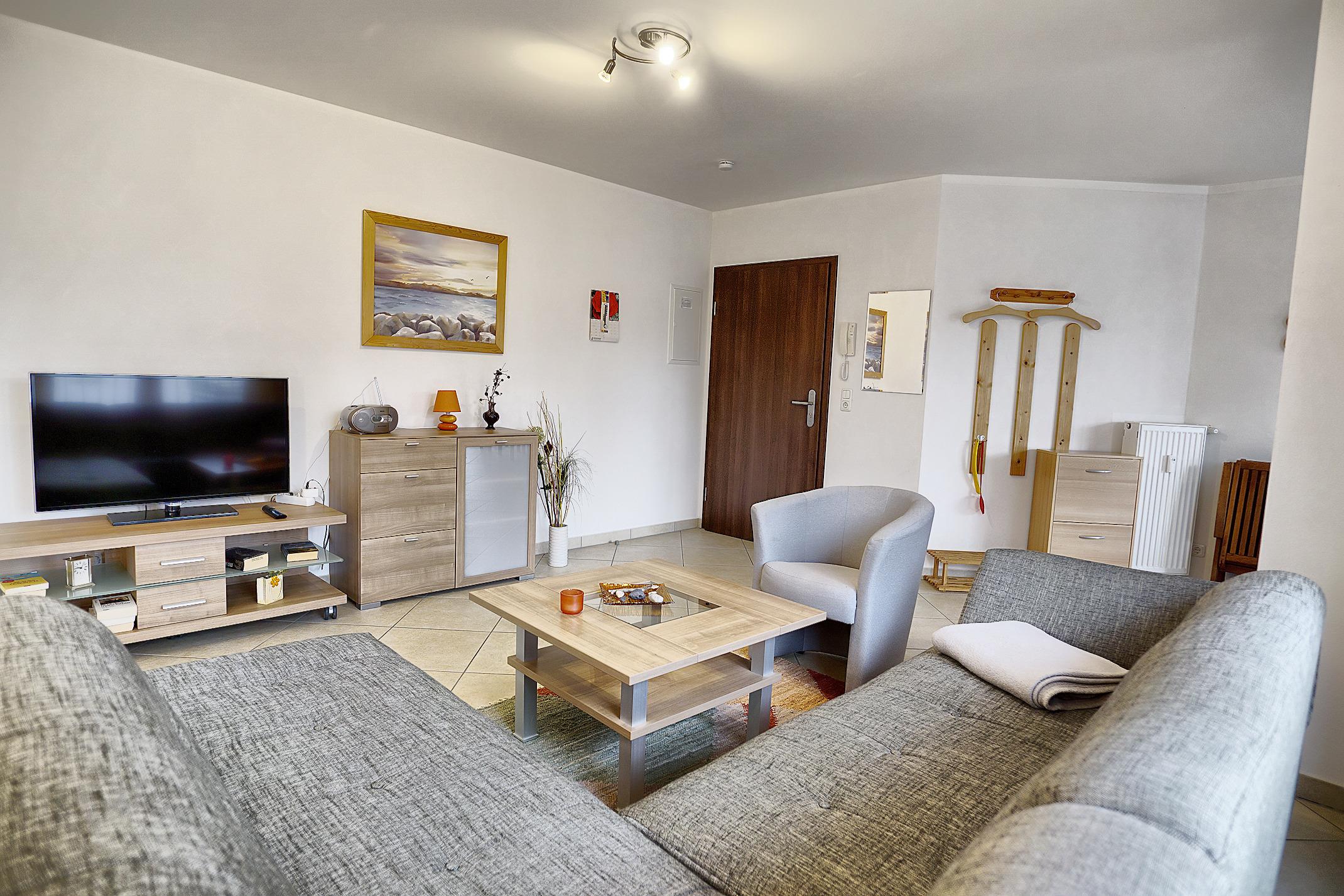 Die 54 qm große, 2007 neu erbaute, Ferienwohnung ist mit viel Komfort für 2-3 Personen eingerichtet. Die Wohnungen sind mit einem Schlafzimmer, einem Doppelbett und einer Ausziehcouch im Wohnzimmer ausgestattet. Dusche und WC sowie ein großzügiger Wohnbereich, in den eine komplett eingerichtete Küche integriert ist, stehen zur Verfügung. Der Balkon ist nach Süd-Westen ausgerichtet.