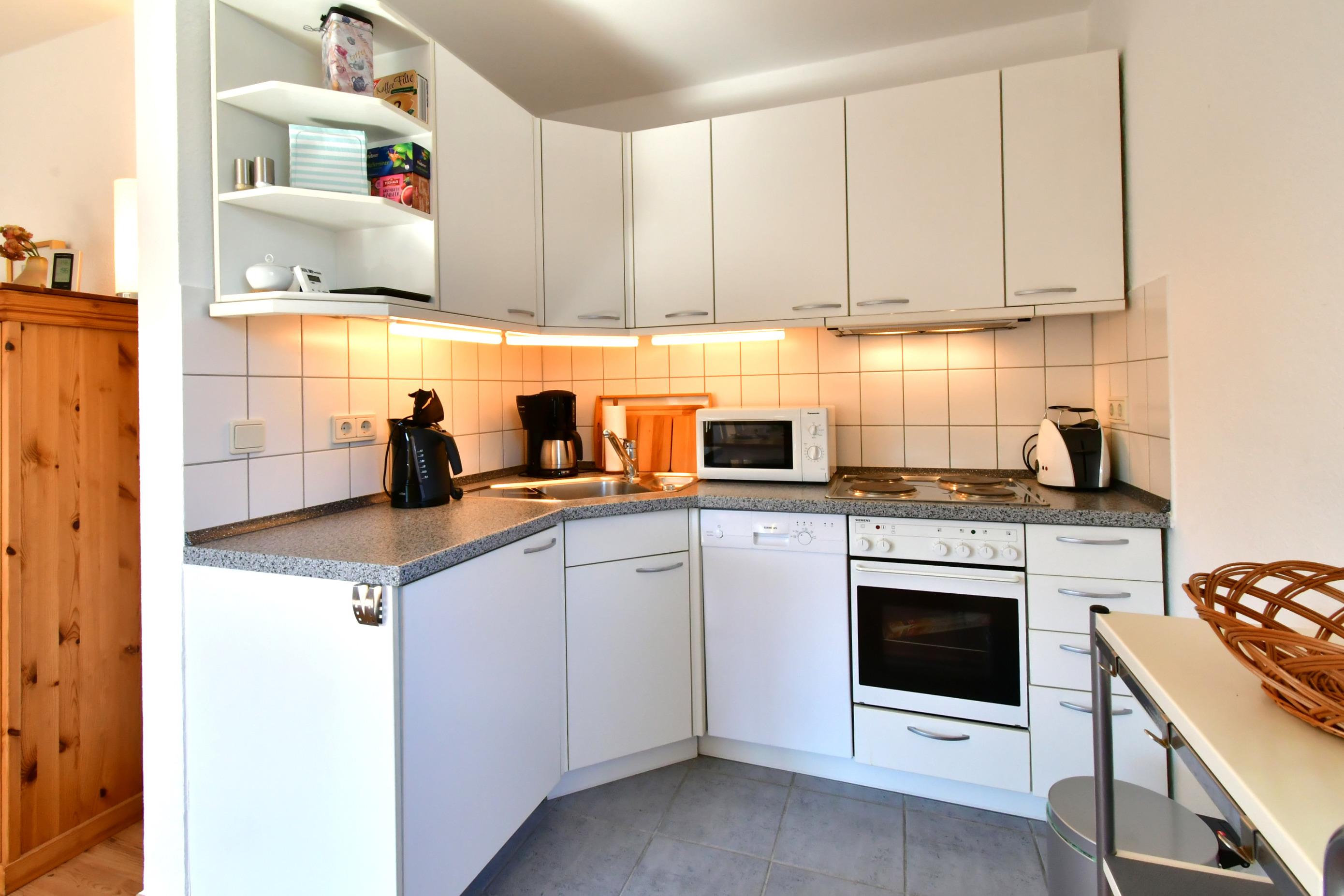 In der gut ausgestatteten Küche finden Sie neben einem Kühlschrank auch eine Mikrowelle und einen Backofen.