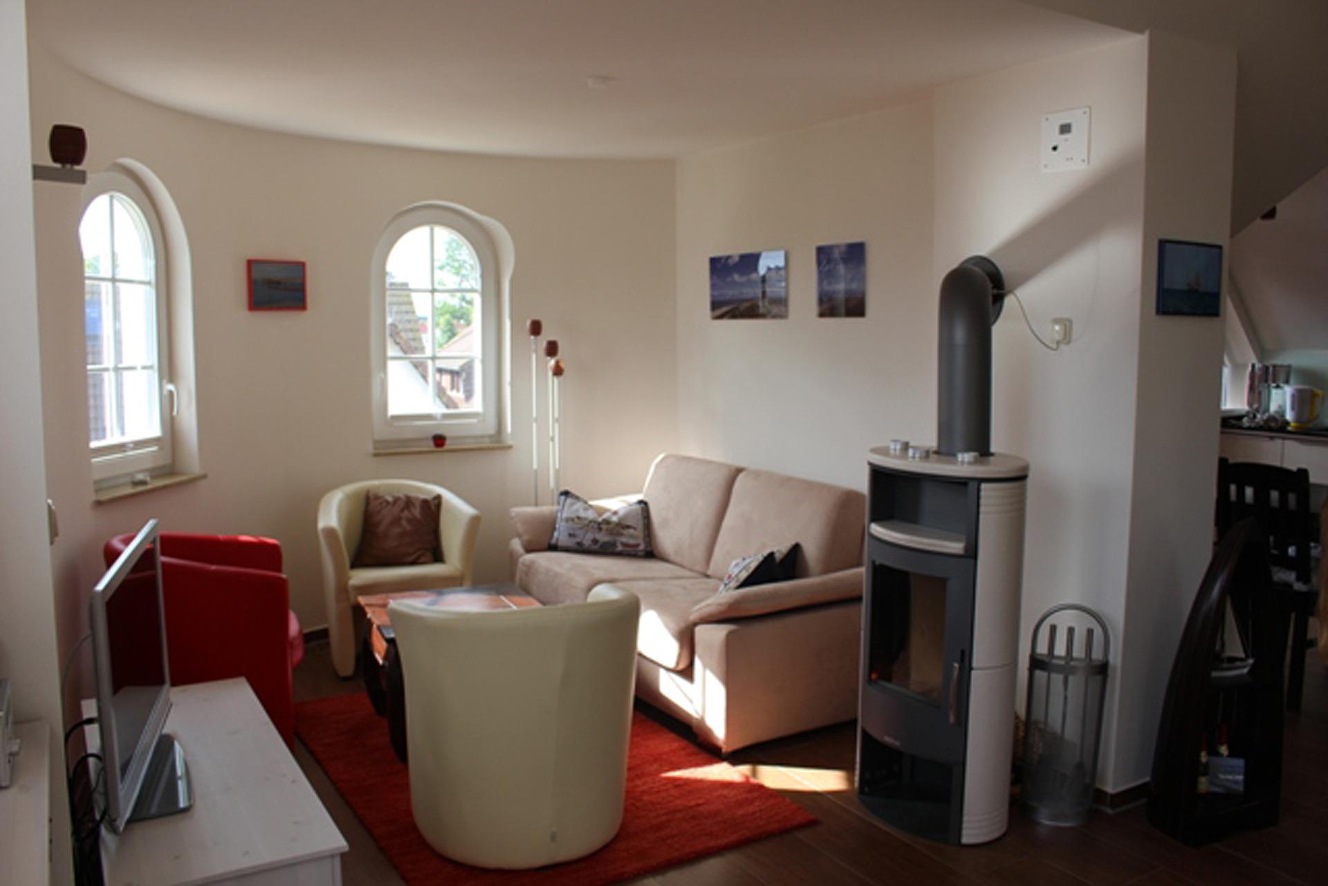 Das 68m² (84 m² NFl.) große Feriendomizil, bestehend aus drei Räumen, bietet Ihnen einen gemütlichen Wohnbereich mit Kaminofen und einen großzügigen Essbereich mit Platz für bis zu sechs Personen. In der kuscheligen Leseecke können Sie entspannt die Füße hochlegen. Die magnolienweiße Hochglanzküche mit schwarzer Granit-Arbeitsplatte ist perfekt eingerichtet, z.B. mit Geschirrspüler, Cerankochfeld, Backofen, Mikrowelle, Wasserkocher und Kaffeemaschinen (Filter und Kapsel Nescafé Dolce Gusto).