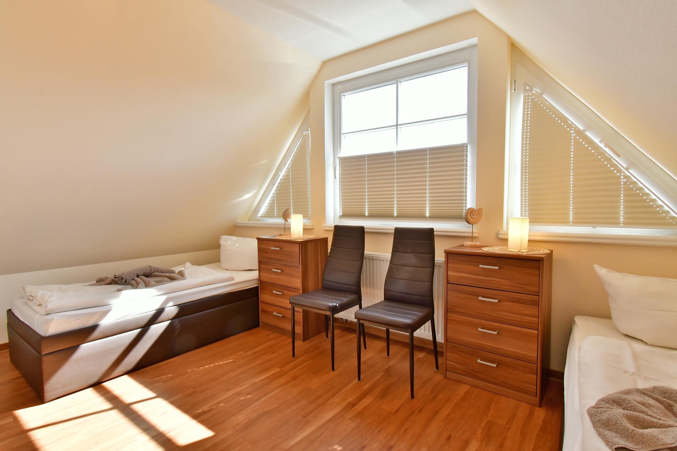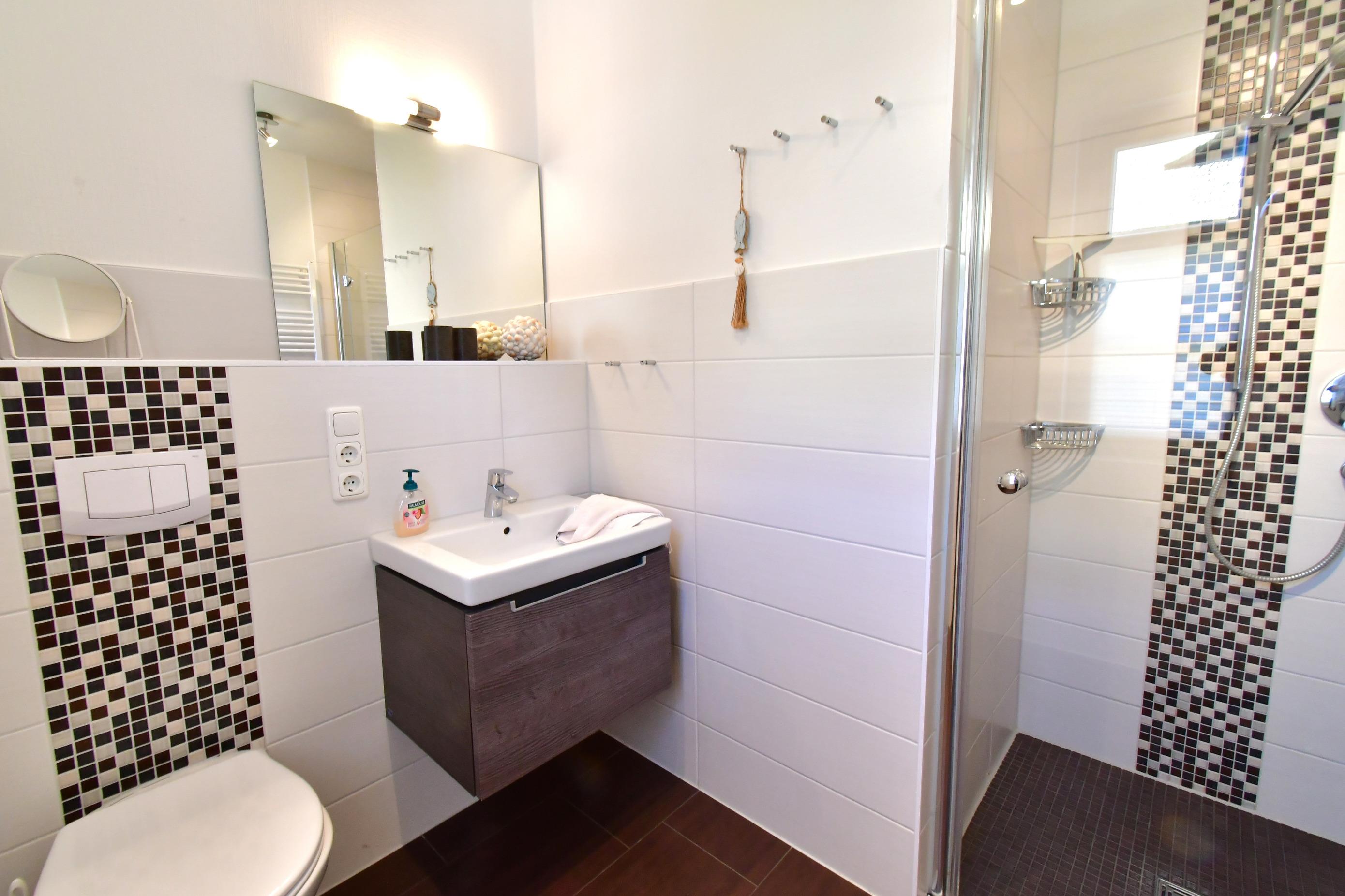 Im EG befindet sich ein Duschbad mit bodengleicher Dusche, sowie der mit Waschmaschine und Trockner (gegen Gebühr/Kleingeld)ausgestattete Hauswirtschaftsraum. Im Obergeschoss befindet sich das Bad mit Sauna (gegen Gebühr), großer bodengleicher Dusche, 2 Schlafzimmer, davon eins mit Balkon um die untergehende Sonne zu genießen.