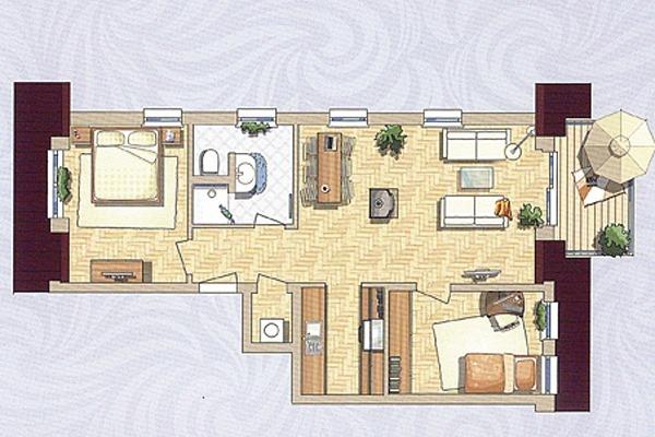 Auf den 67 qm Wohnfläche sind ein Schlafzimmer mit Doppelbett 180 x 200, ein Schlafzimmer mit Bett (Bettsofa) von 140 x 200, eine separierte Küche, eine große Essecke, ein Wohnzimmer mit 2,5 Sitz - Sofa und 2 drehbaren Sesseln, ein Badezimmer, ein großer Balkon mit 4 hydraulisch regelbaren Multifunktionssesseln und eine Abseite untergebracht. Ein AEG Staubsauger ist vorhanden.