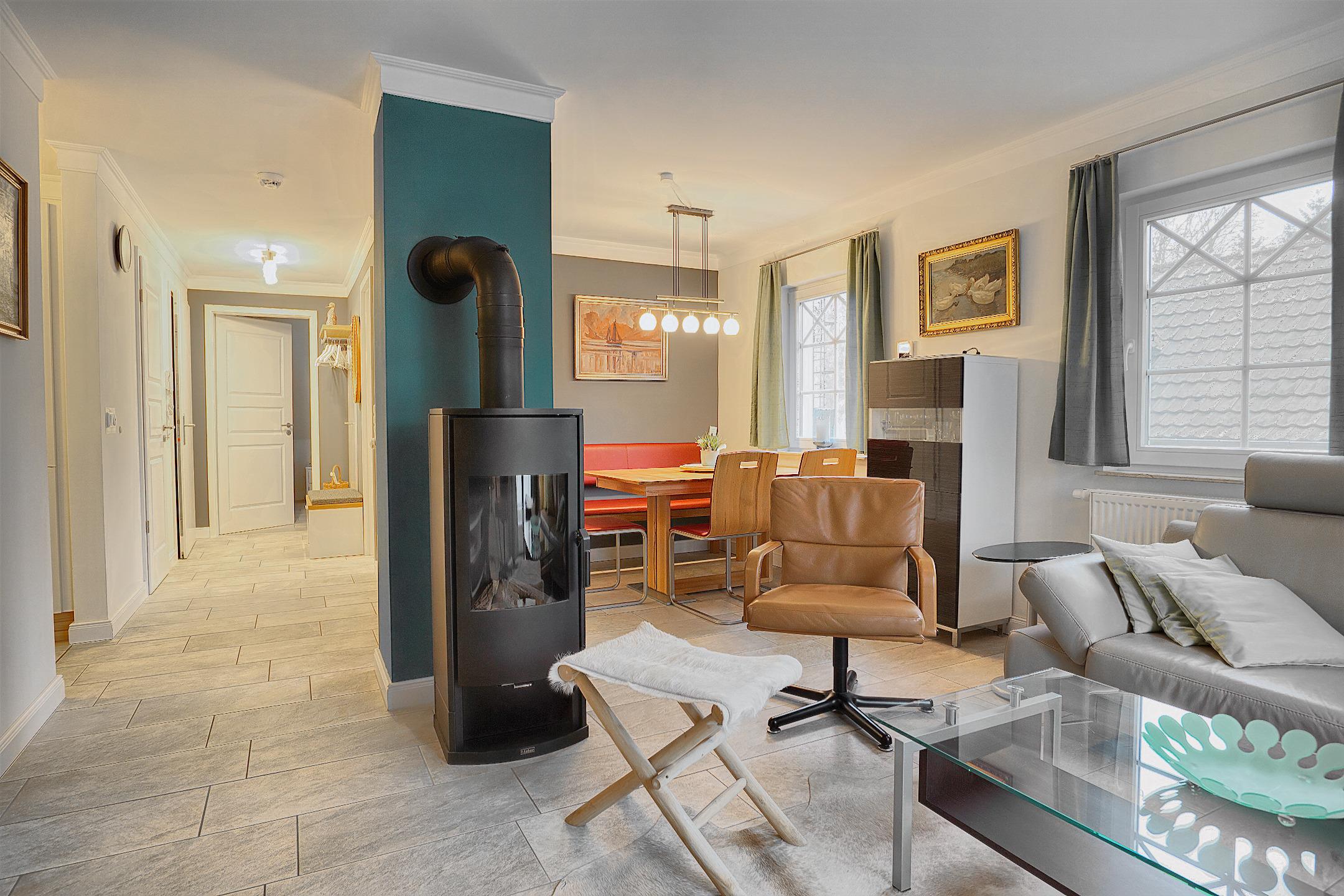 Im Wohn- und jedem Schlafraum befindet sich ein Flachbild - TV. Bei der Einrichtung wurde Wert auf zeitlose Eleganz der hochwertigen Vollholz- und Ledermöbel gelegt. Bequemlichkeit und Wohlbefinden spielten eine große Rolle bei dem Design, den Accessoires und der Farbgebung.