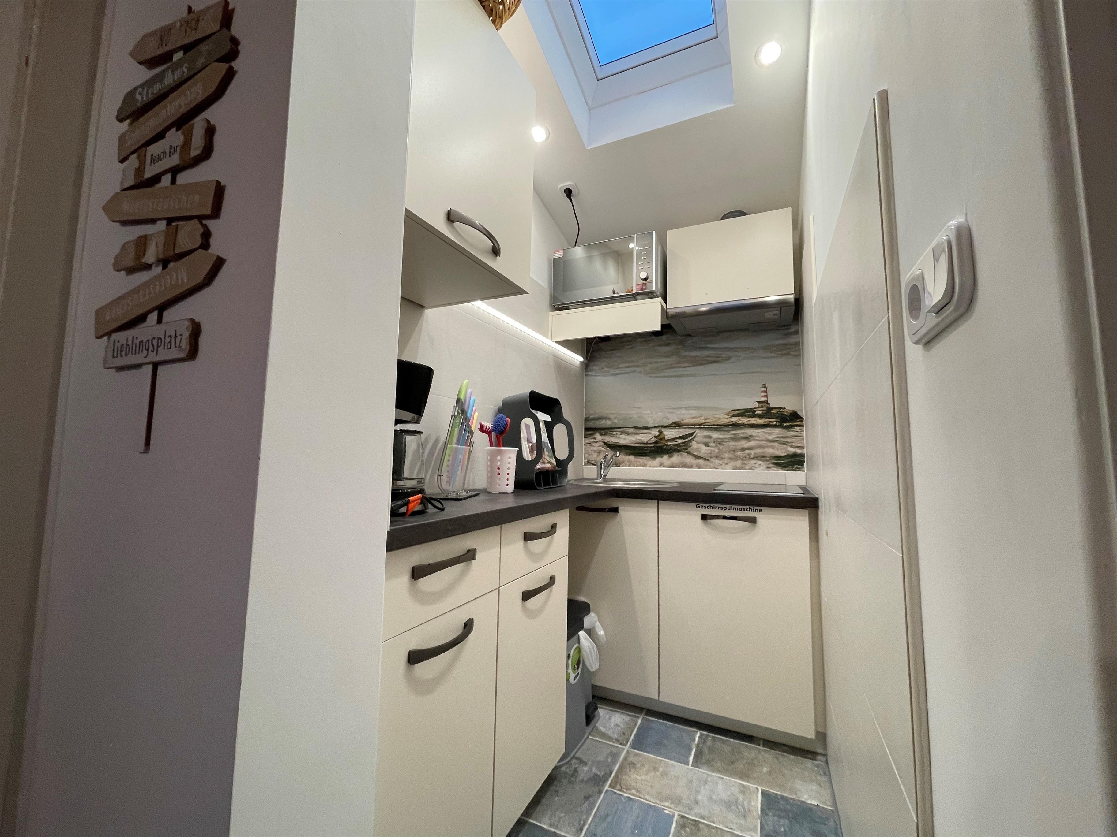 Ein maritim gestaltetes Feriennest im hellen Dachgeschoß mit separatem Eingang, kleiner ebenerdiger Terrasse und einem Balkon im 1. Obergeschoß, von dem aus Sie den Zingster Überblick, wie ein Kapitän auf seiner Brück, haben. Es ist auf etwas über 35 qm alles vorhanden, was zwei Personen im Urlaub benötigen. Ein Traum für Naturliebhaber und Strandnixen, die ein komfortables und liebevoll eingerichtetes Dach über dem Kopf suchen, aber keinen Tanzsaal benötigen.