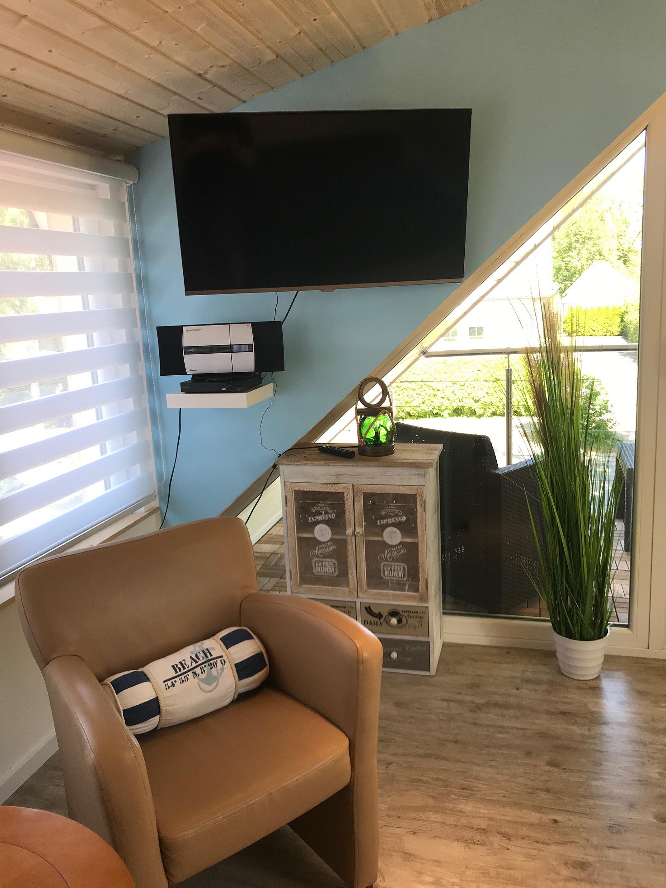 Der Zugang zur Wohnung erfolgt über eine Treppe, ähnlich wie hinauf in die Kommandobrücke eines Containerschiffes. Menschen mit Gehbehinderung raten wir von der Buchung dieser Unterkunft ab, für alle Anderen ist der Weg hinauf in das Piratennest kein Problem.