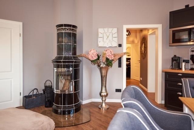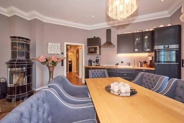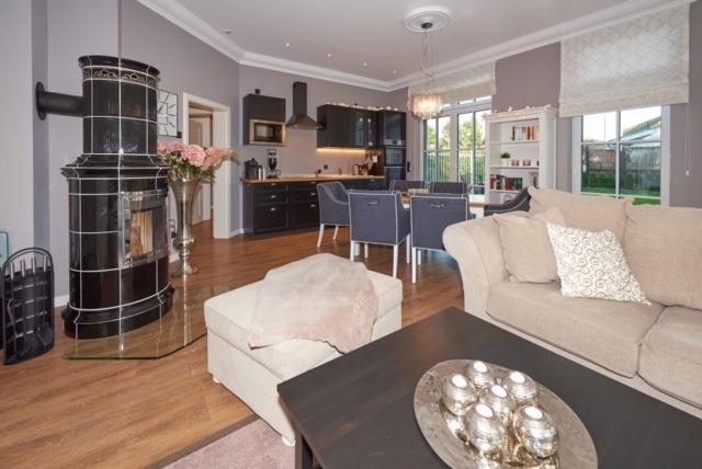 Die ebenerdig liegende ca 84 qm große Ferienwohnung "Sehnsucht Victoria Luna 2" mit Ost/Südterrasse verfügt über ein geräumiges und gemütlich eingerichtetes Wohnzimmer mit Küchen- Essbereich sowie einem Kamin.