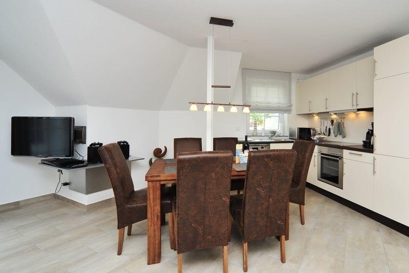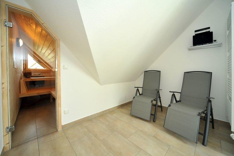 Der Wohnbereich lädt zum Verweilen ein. Der Kamin sorgt besonders an kalten Wintertagen für wohlige Atmosphäre. In der voll ausgestatteten Küche können Sie leckere Gerichte zubereiten, die Sie dann am Esstisch verzehren können. Darüber hinaus verfügt die Ferienwohnung über 2 Schlafzimmer mit Doppelbett und 2 Badezimmer, eines davon sogar mit Sauna!