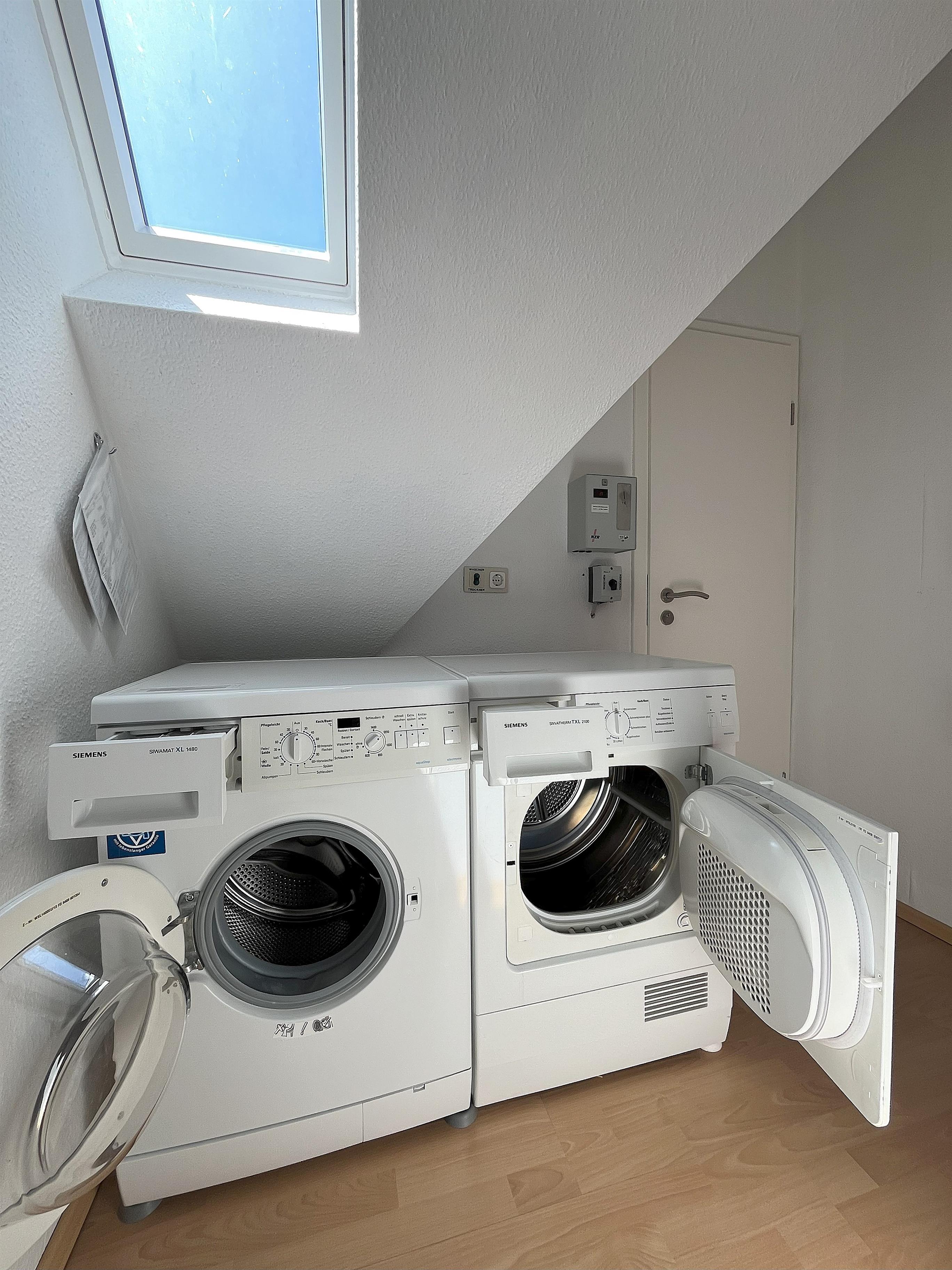 Waschmaschine, Trockner, Bügeleisen, Bügelbrett und Fön vorhanden.