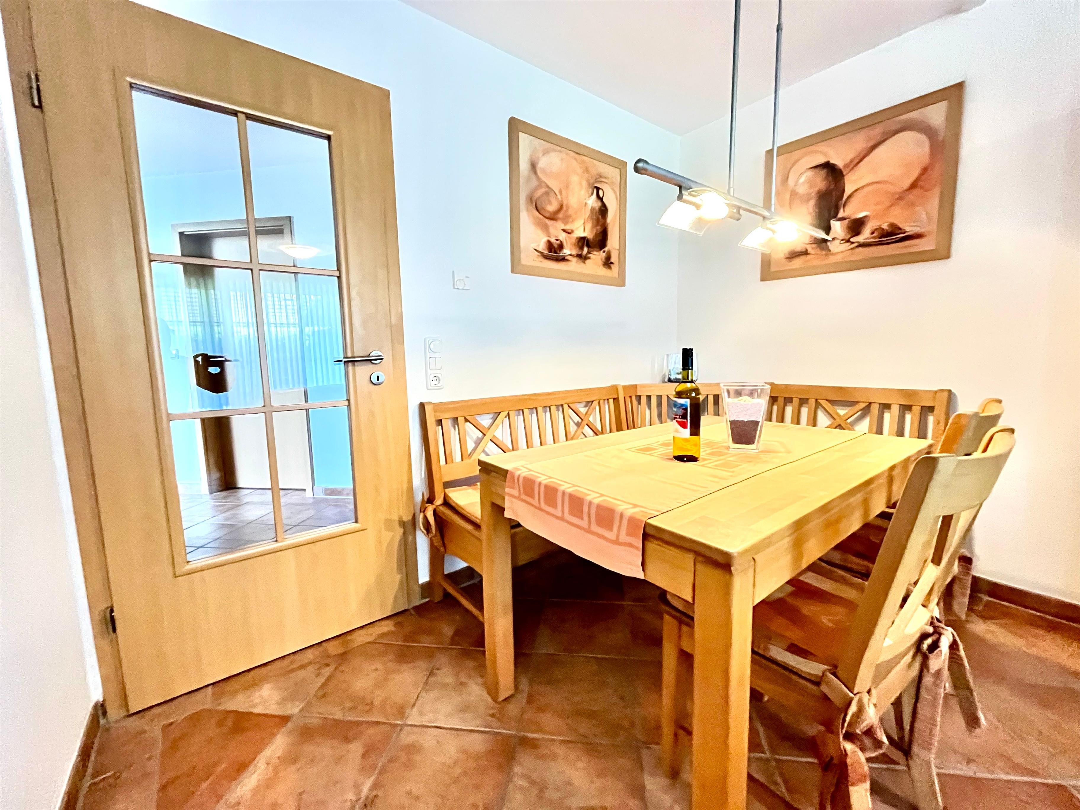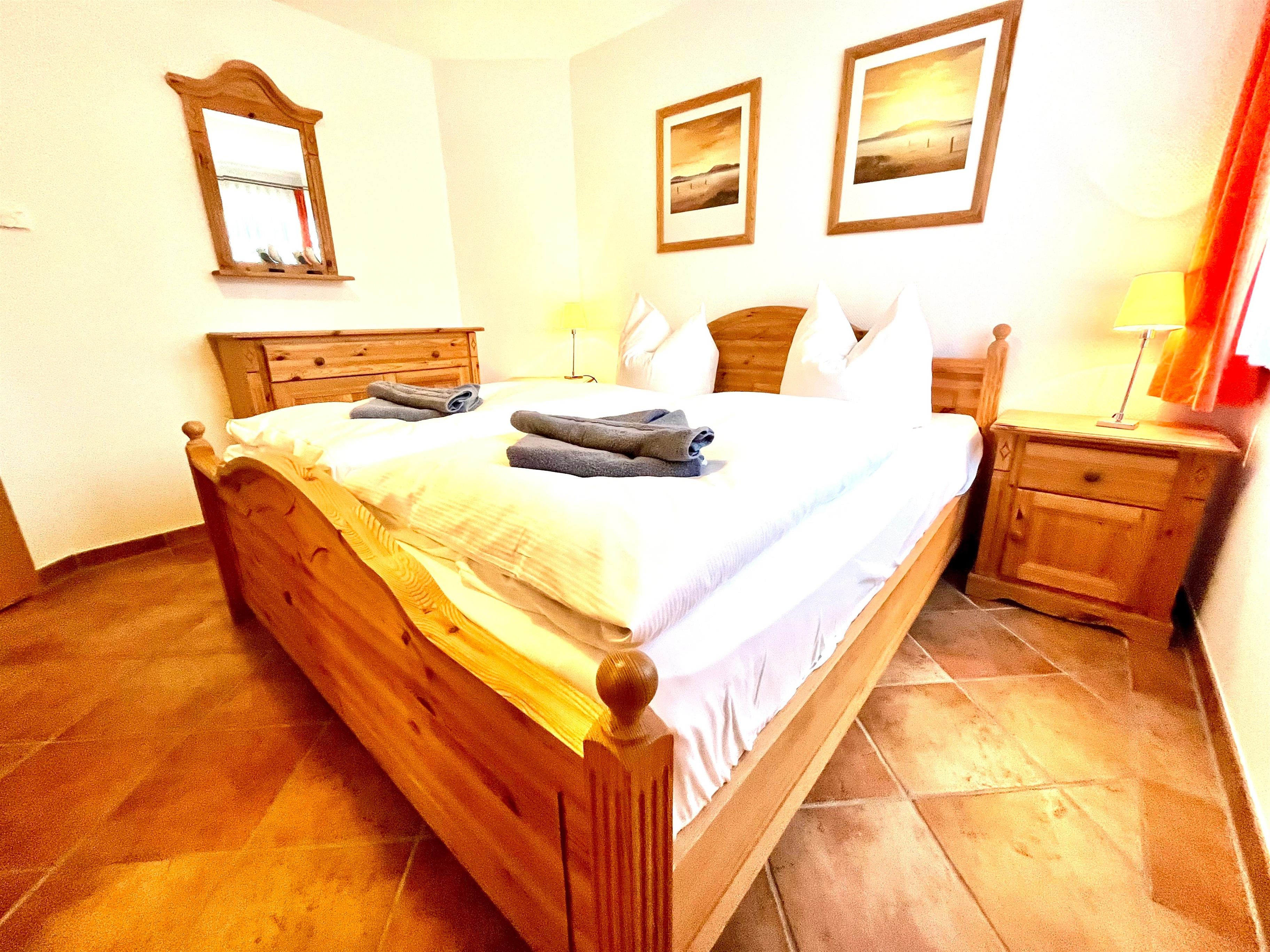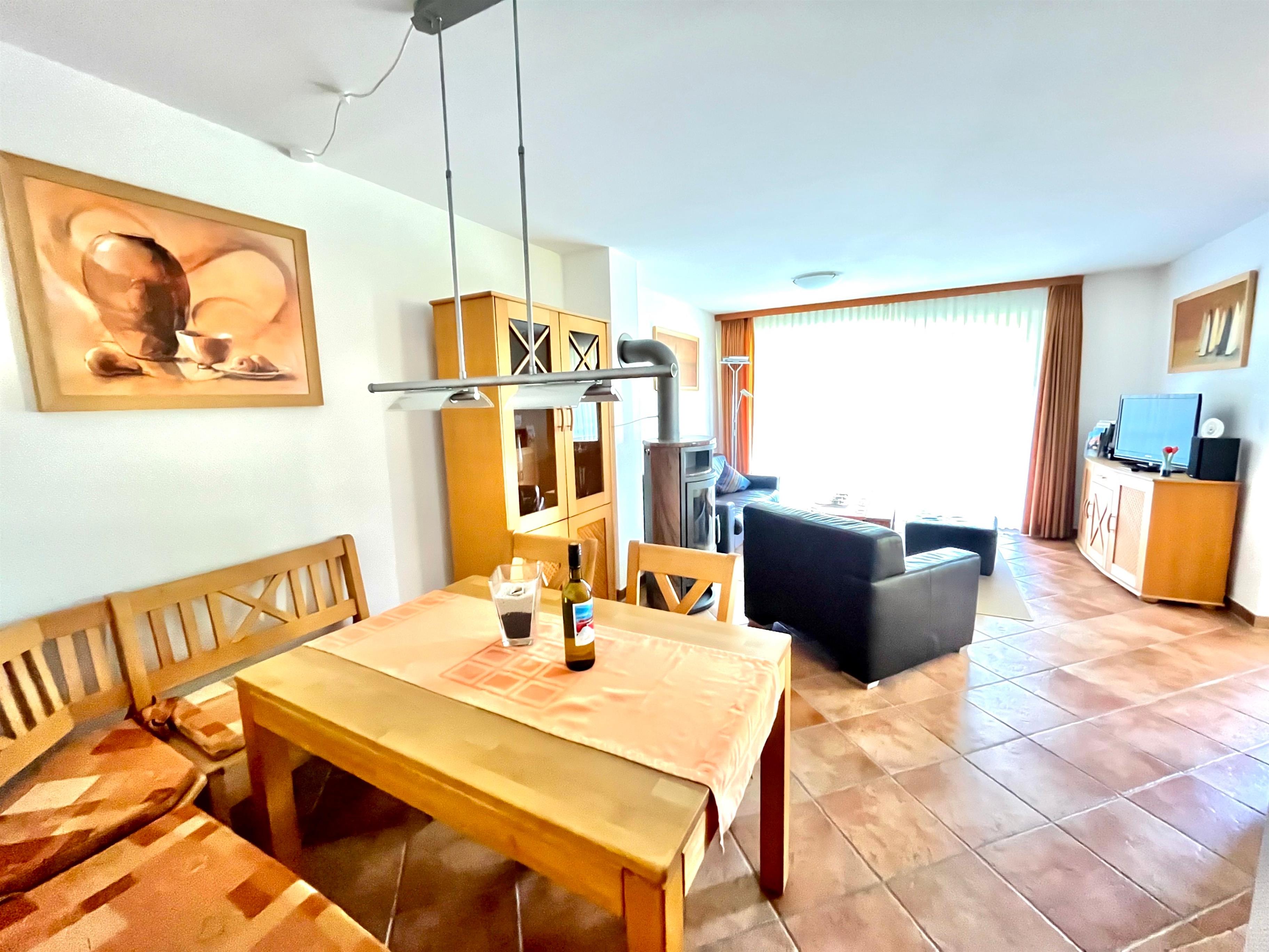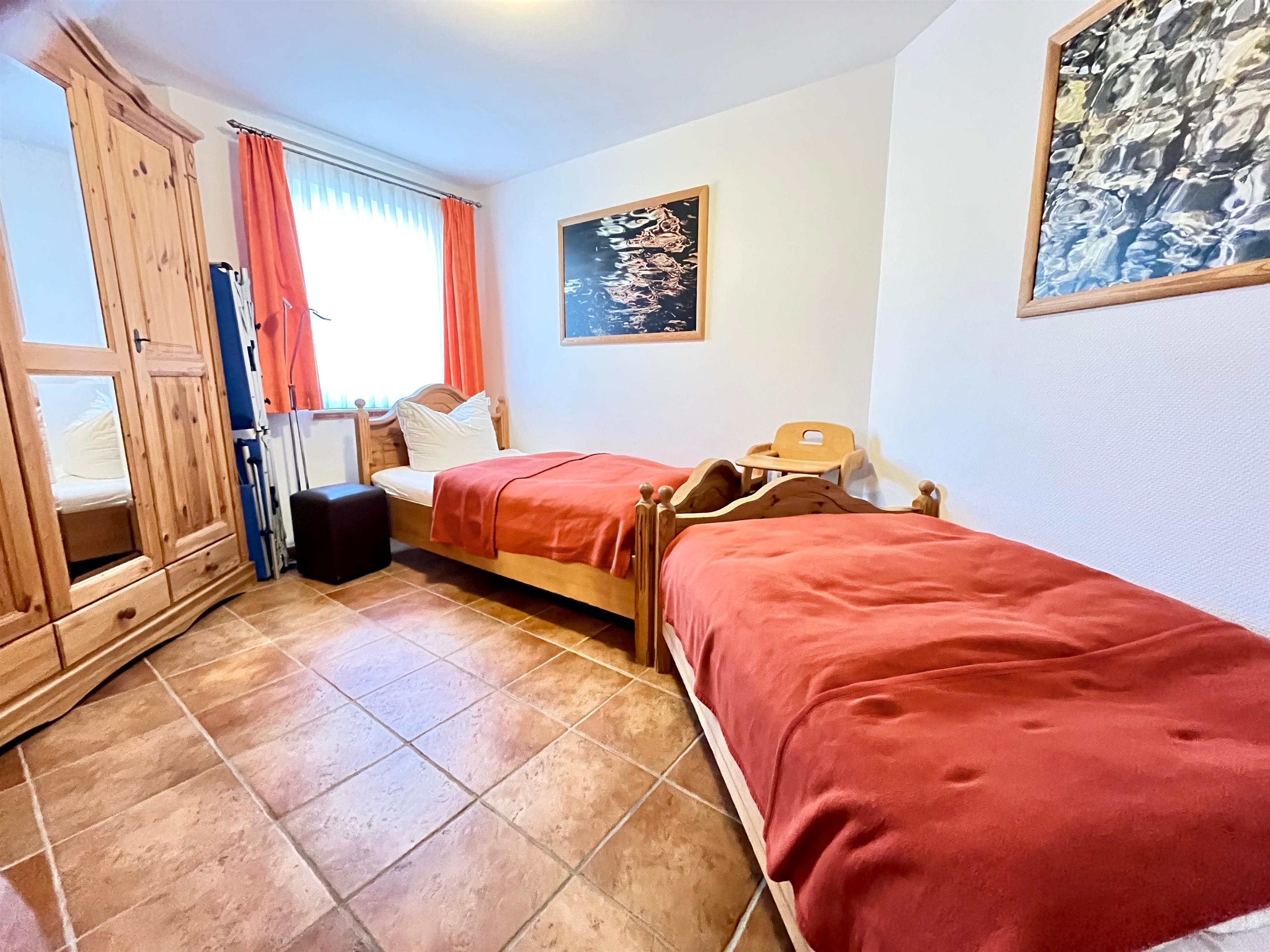 Die gemütliche und vollausgestattete 3-Zimmer-Wohnung bietet im Erdgeschoss mit der überdachten Terrasse und dem kleinen Garten die beste Voraussetzung, um sich zu erholen. Im 'Eltern'-Schlafzimmern finden Sie ein großes Doppelbett, im 'Kinder'-Zimmer zwei große Einzelbetten. Das zusätzliche Babybett bereiten wir Ihnen vor, wenn Sie uns bei Buchung einen Hinweis geben. Das Wohnzimmer mit der offenen Küche lässt Spielraum für die ganze Familie. Wenn die Jahreszeit kuschlige Momente sehnsüchtig einfordert, schenkt Ihnen der Kaminofen reinste Behaglichkeit. Neben einem Flachbildschirm, Radio und Internet (WLAN) stehen auch Spiele zur Verfügung. In der Küche finden Sie Geschirrspüler, Kühlschrank mit Gefrierteil, Herd und Cerankochfeld, Kaffeemaschine, Toaster, Wasserkocher und vieles mehr. Für die ganz kleinen Gäste steht ein Kinderstuhl zur Verfügung.