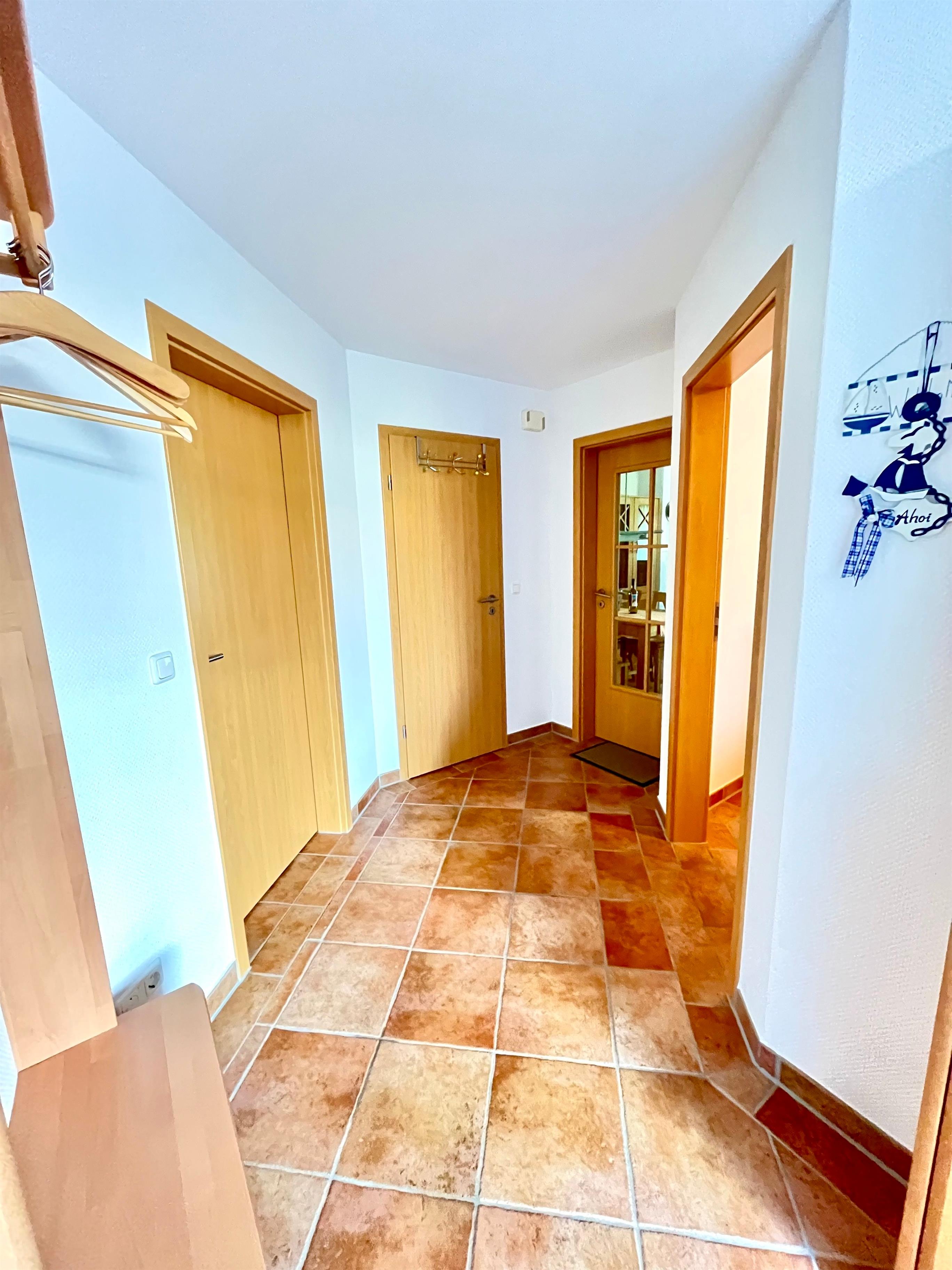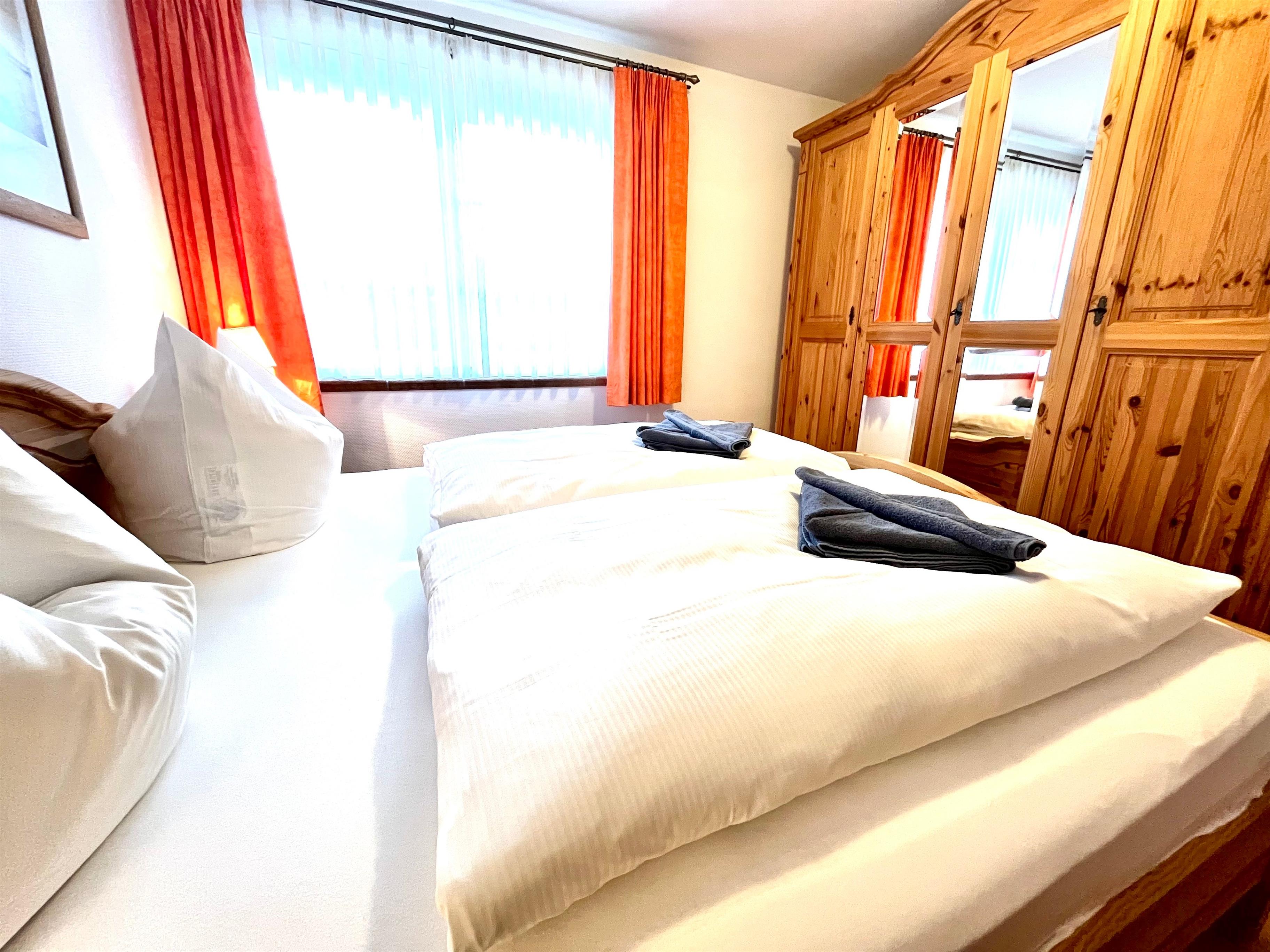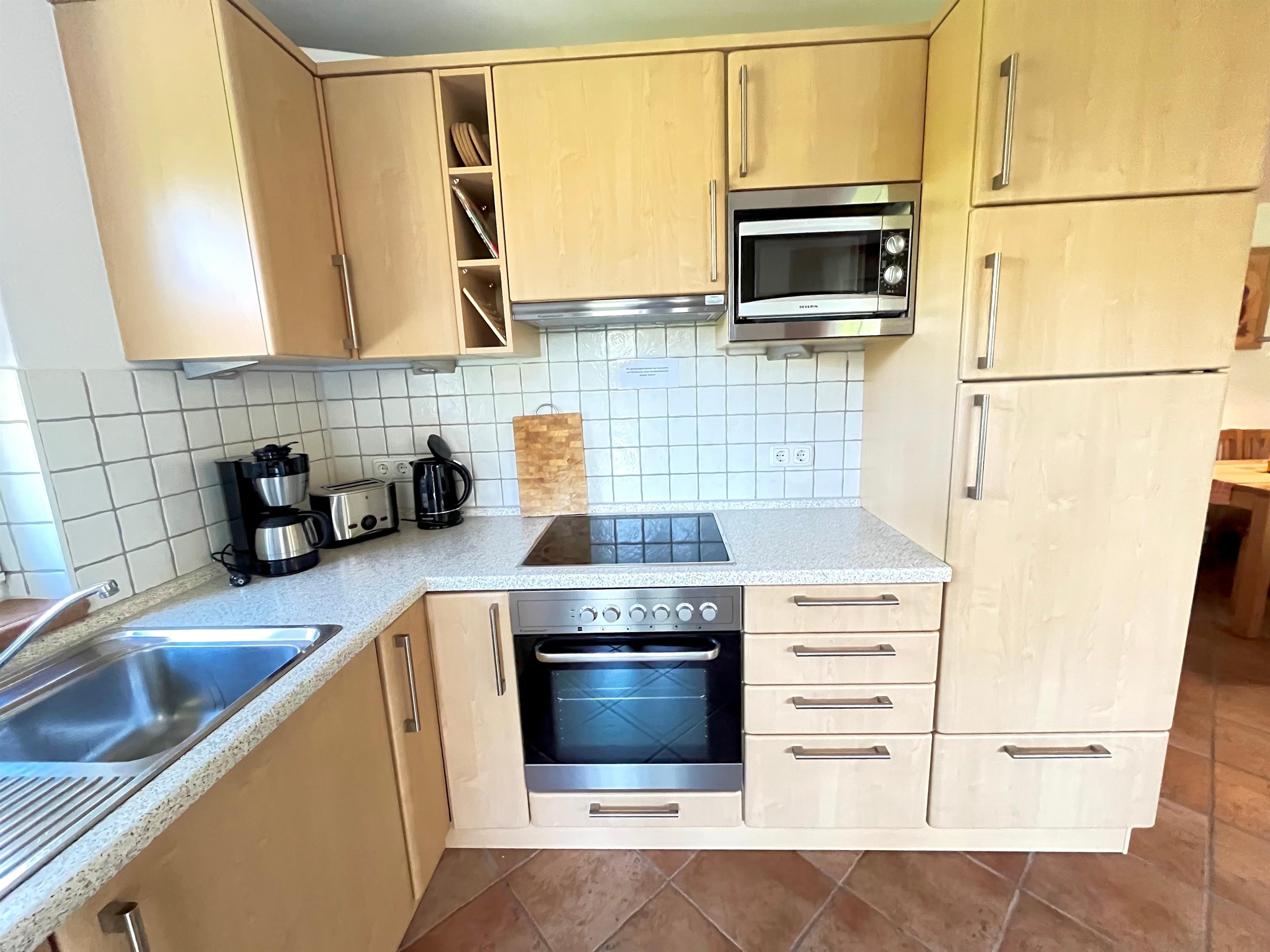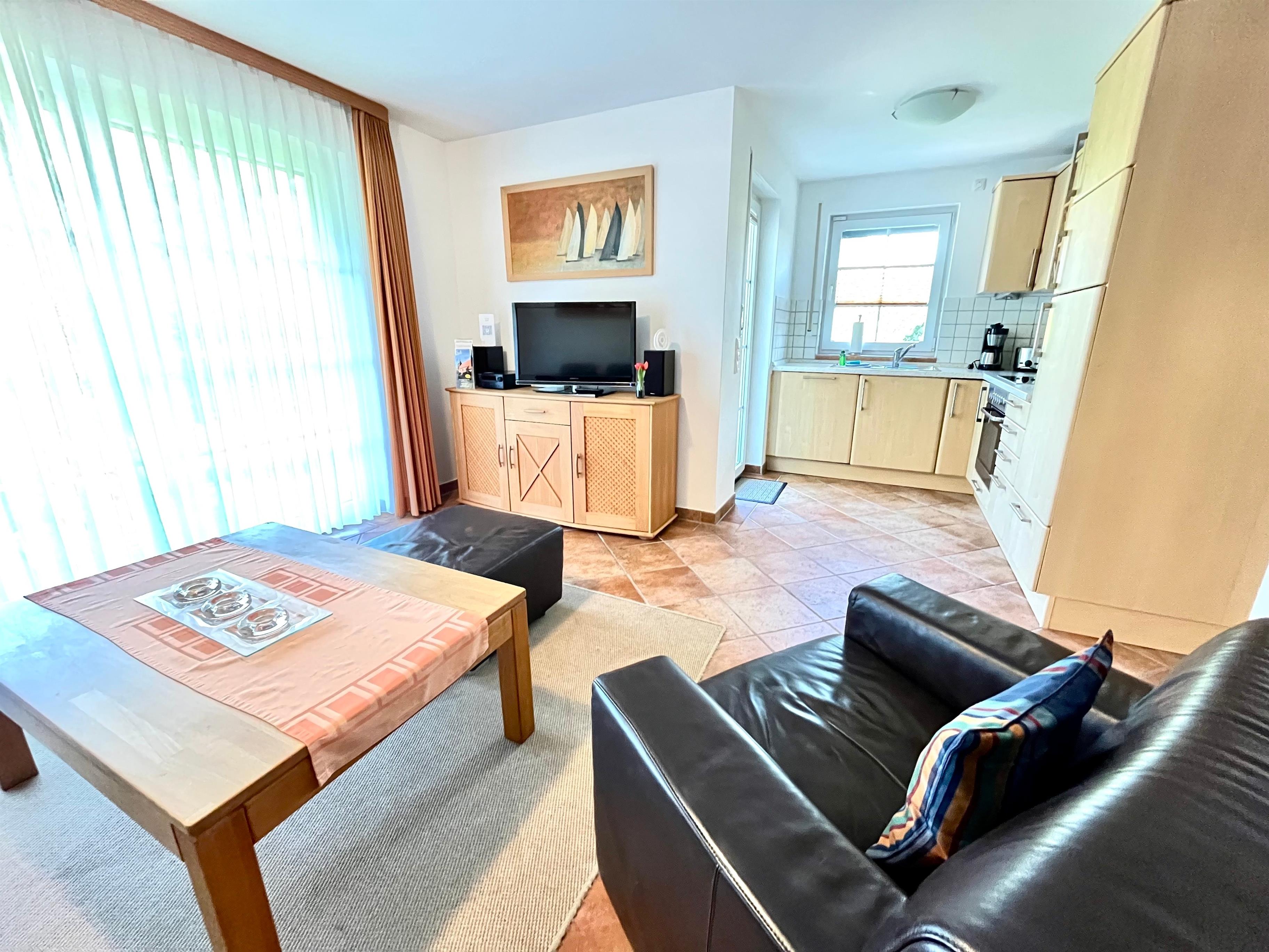 Die gemütliche und vollausgestattete 3-Zimmer-Wohnung bietet im Erdgeschoss mit der überdachten Terrasse und dem kleinen Garten die beste Voraussetzung, um sich zu erholen. Im 'Eltern'-Schlafzimmern finden Sie ein großes Doppelbett, im 'Kinder'-Zimmer zwei große Einzelbetten. Das zusätzliche Babybett bereiten wir Ihnen vor, wenn Sie uns bei Buchung einen Hinweis geben. Das Wohnzimmer mit der offenen Küche lässt Spielraum für die ganze Familie. Wenn die Jahreszeit kuschlige Momente sehnsüchtig einfordert, schenkt Ihnen der Kaminofen reinste Behaglichkeit. Neben einem Flachbildschirm, Radio und Internet (WLAN) stehen auch Spiele zur Verfügung. In der Küche finden Sie Geschirrspüler, Kühlschrank mit Gefrierteil, Herd und Cerankochfeld, Kaffeemaschine, Toaster, Wasserkocher und vieles mehr. Für die ganz kleinen Gäste steht ein Kinderstuhl zur Verfügung.